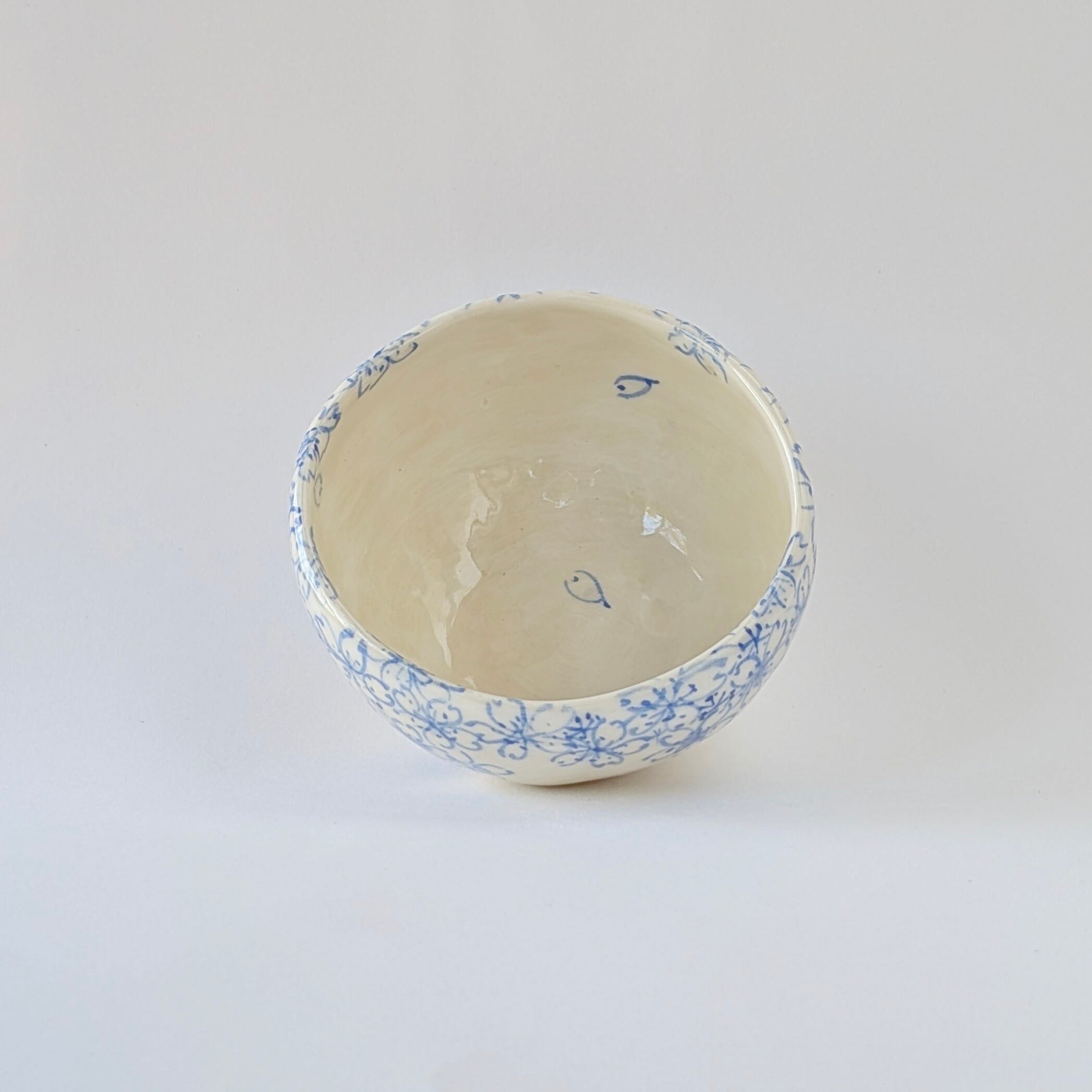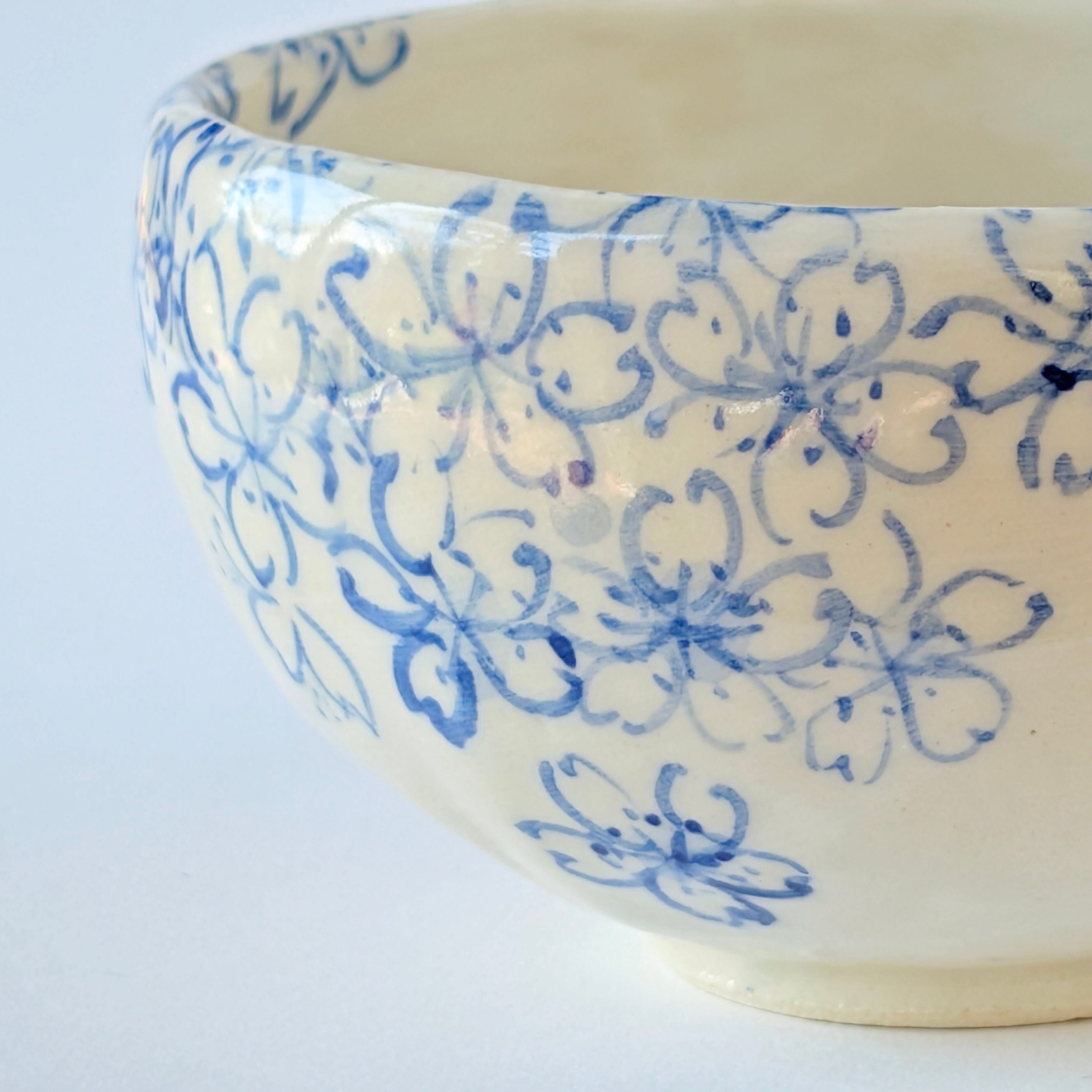 涼やかな青い桜の花を、ふわりと散りばめたご飯茶碗。古くから愛される桜模様を現代風にアレンジし、どこか懐かしさを感じる、アンティークのような落ち着いた雰囲気に仕上げました。