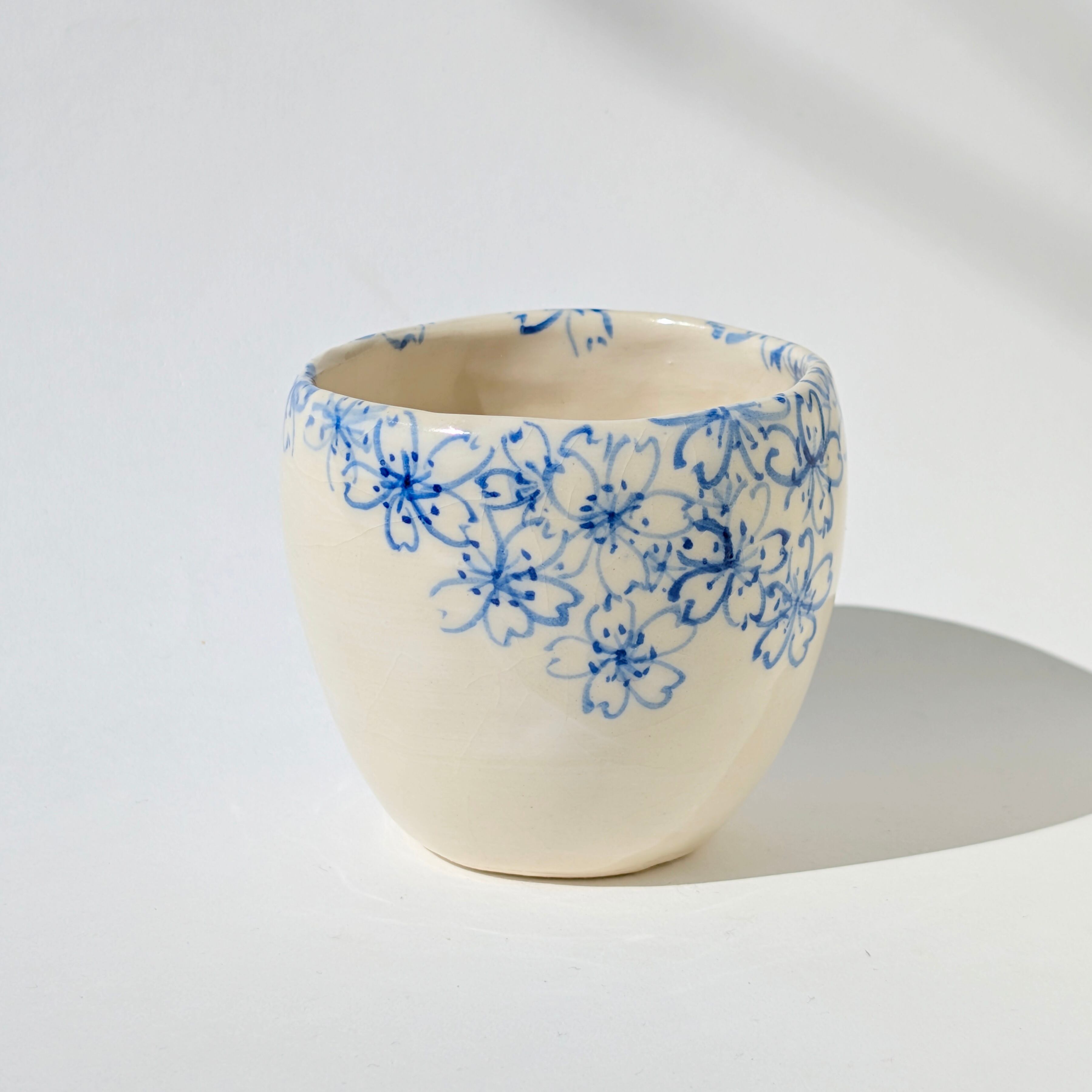 澄み渡る青空のような、涼やかな青い桜の花を、ふわりと散りばめたミニ湯呑み。古くから愛される桜模様を現代風にアレンジし、どこか懐かしさを感じる、アンティークのような落ち着いた雰囲気に仕上げました。