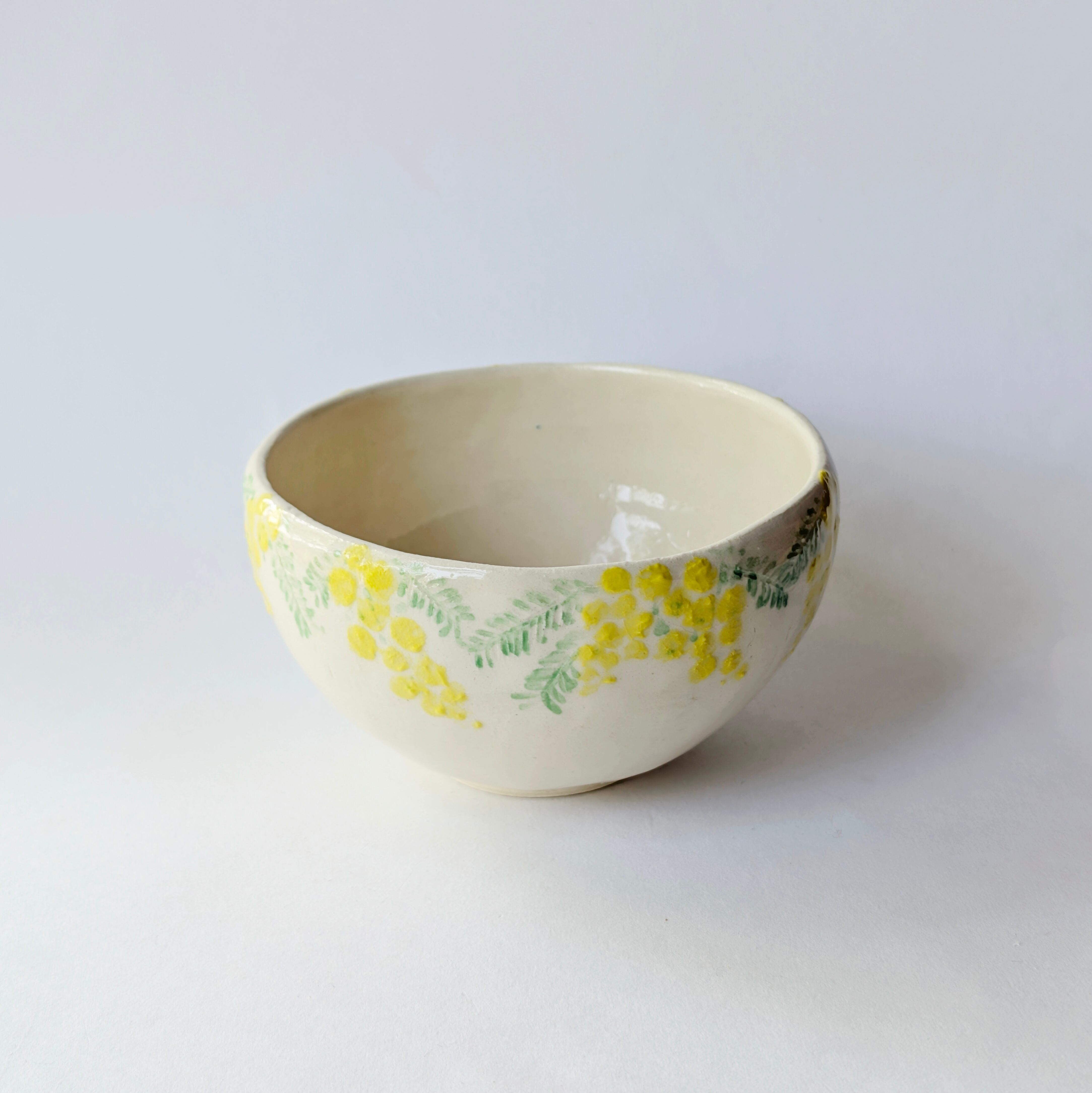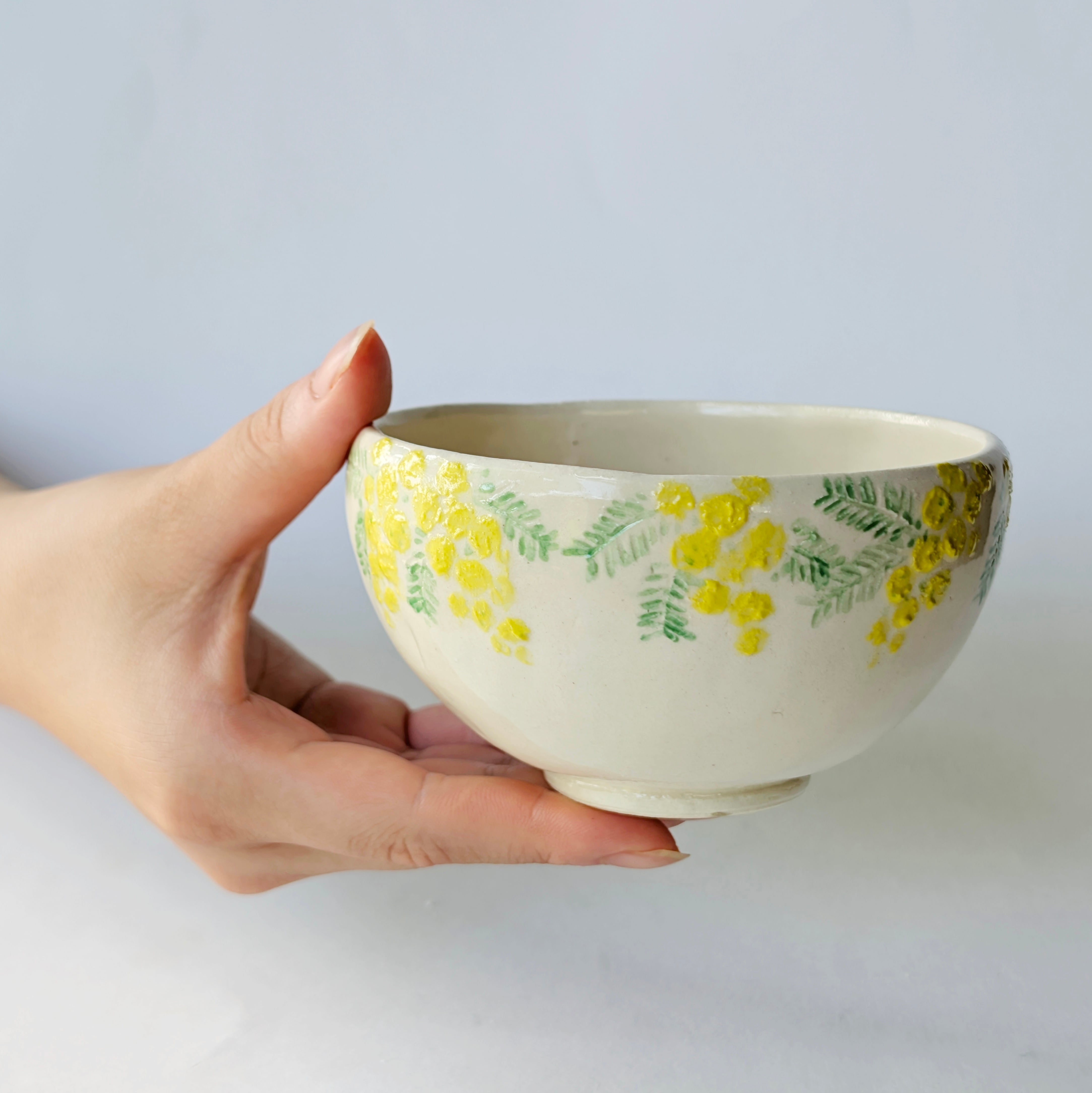 ふっくらとした柔らかなフォルムに、明るい黄色のミモザが咲きました。手にしっくりと馴染む、日常使いにぴったりの大きさのご飯茶碗です。