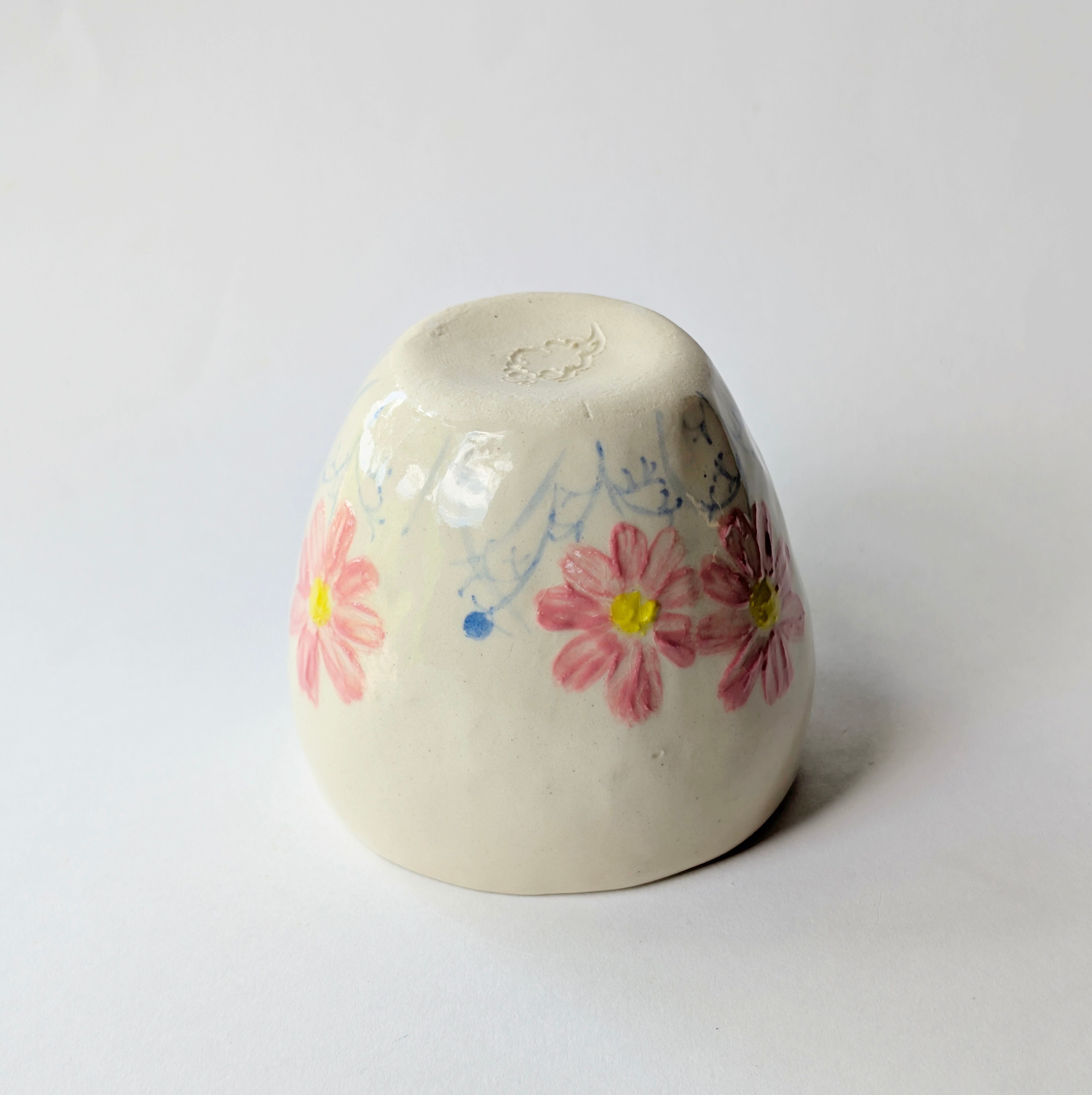 一つひとつ丁寧に作られた陶器は、手仕事ならではの温かみと、優しい風合いが特徴です。コスモスの花びらは土絵の具(どべえのぐ)を用いて描かれ、ぷっくりとした立体感が楽しめます。繊細な花びら一枚一枚に、職人の技が光ります。土の持つ素朴な表情が、この手描きの意匠を一層引き立てます。