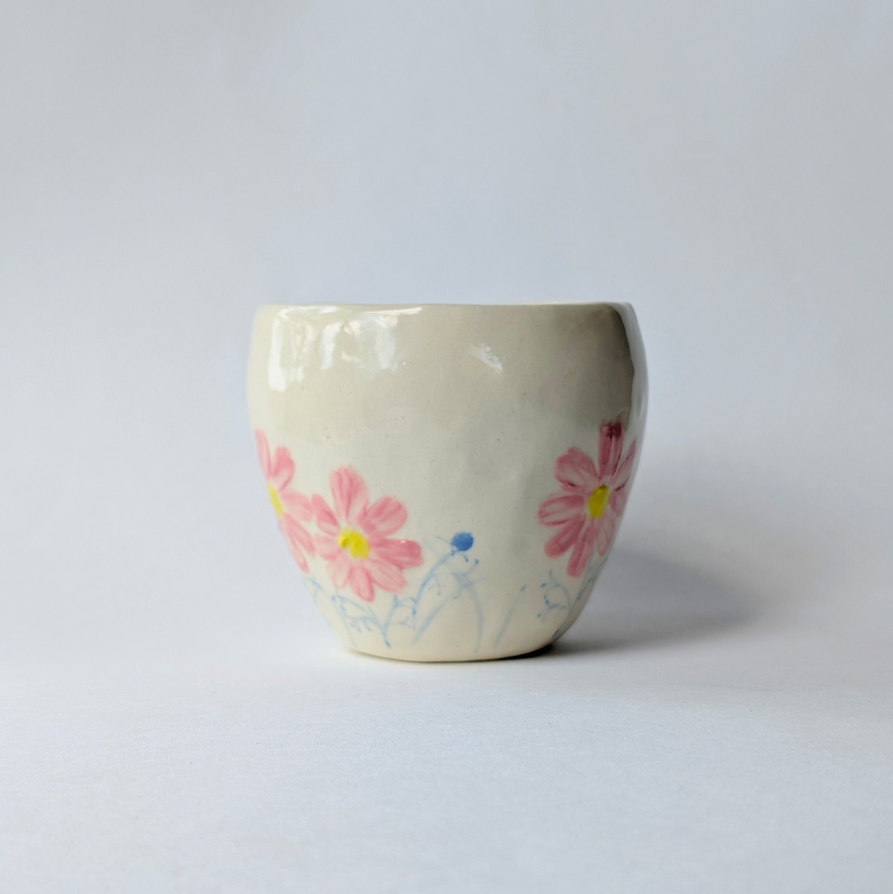 ふっくらとした柔らかなフォルムに、可憐なコスモスが咲き誇る湯呑みです。手のひらに心地よく収まる、愛らしいサイズが魅力。秋風に揺れる可憐なコスモスは、見る人の心を和ませ、穏やかな気持ちにさせてくれます。