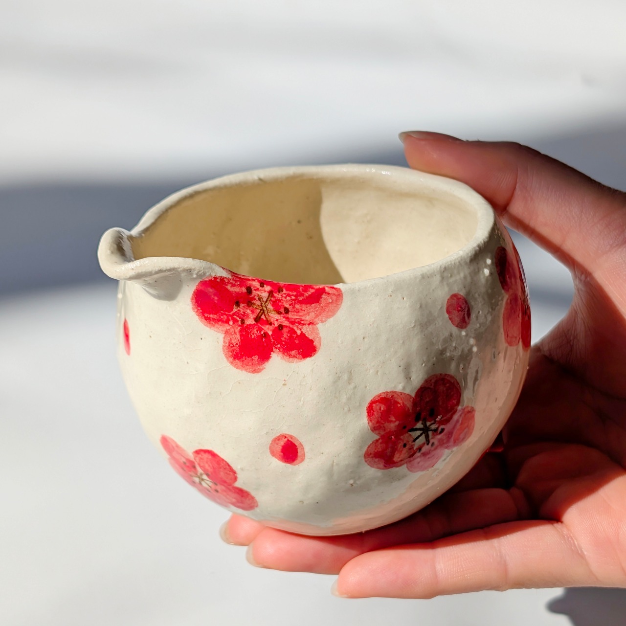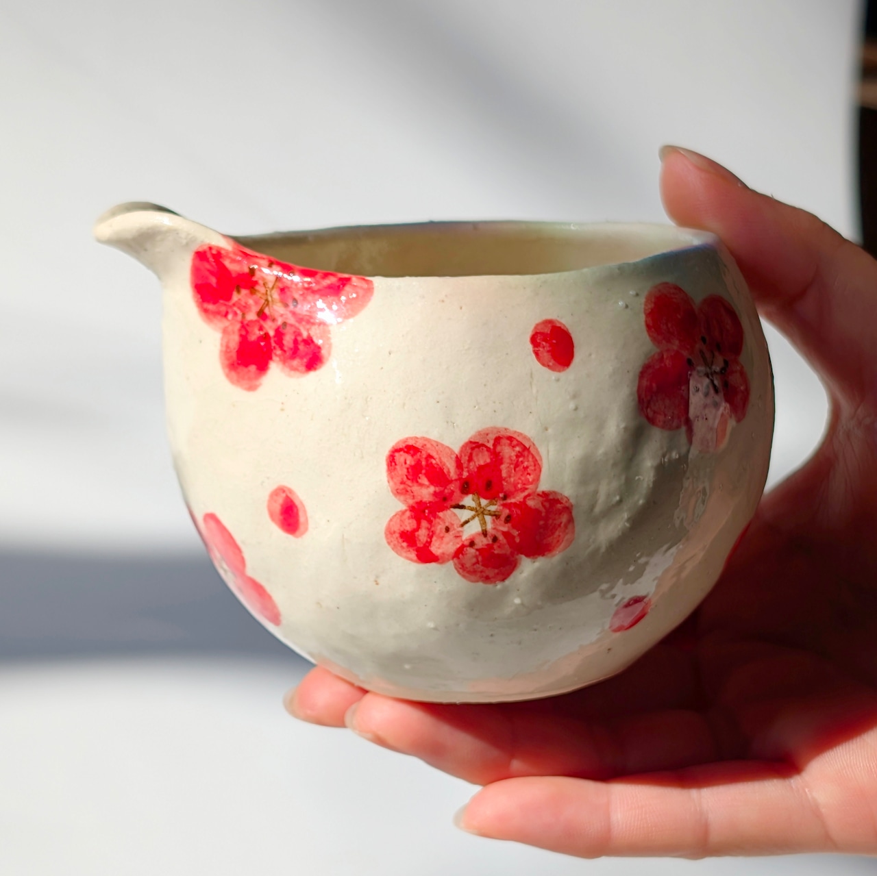 触れて楽しむ、立体的な梅の花 白地に映える紅梅は、花びら一枚一枚を丁寧に描き上げました。同じものがひとつとしてない手仕事ならではの温かみを伝えます。