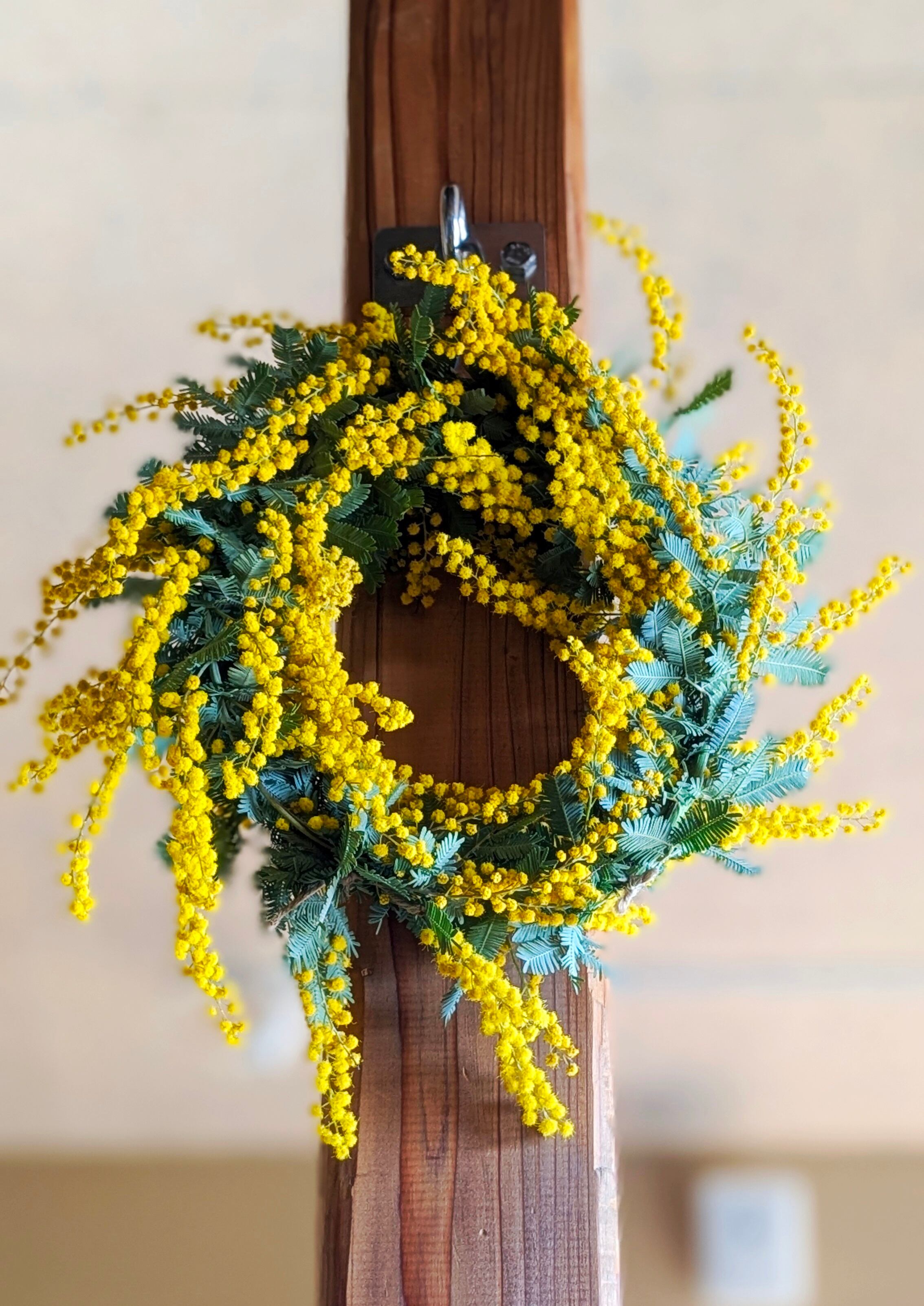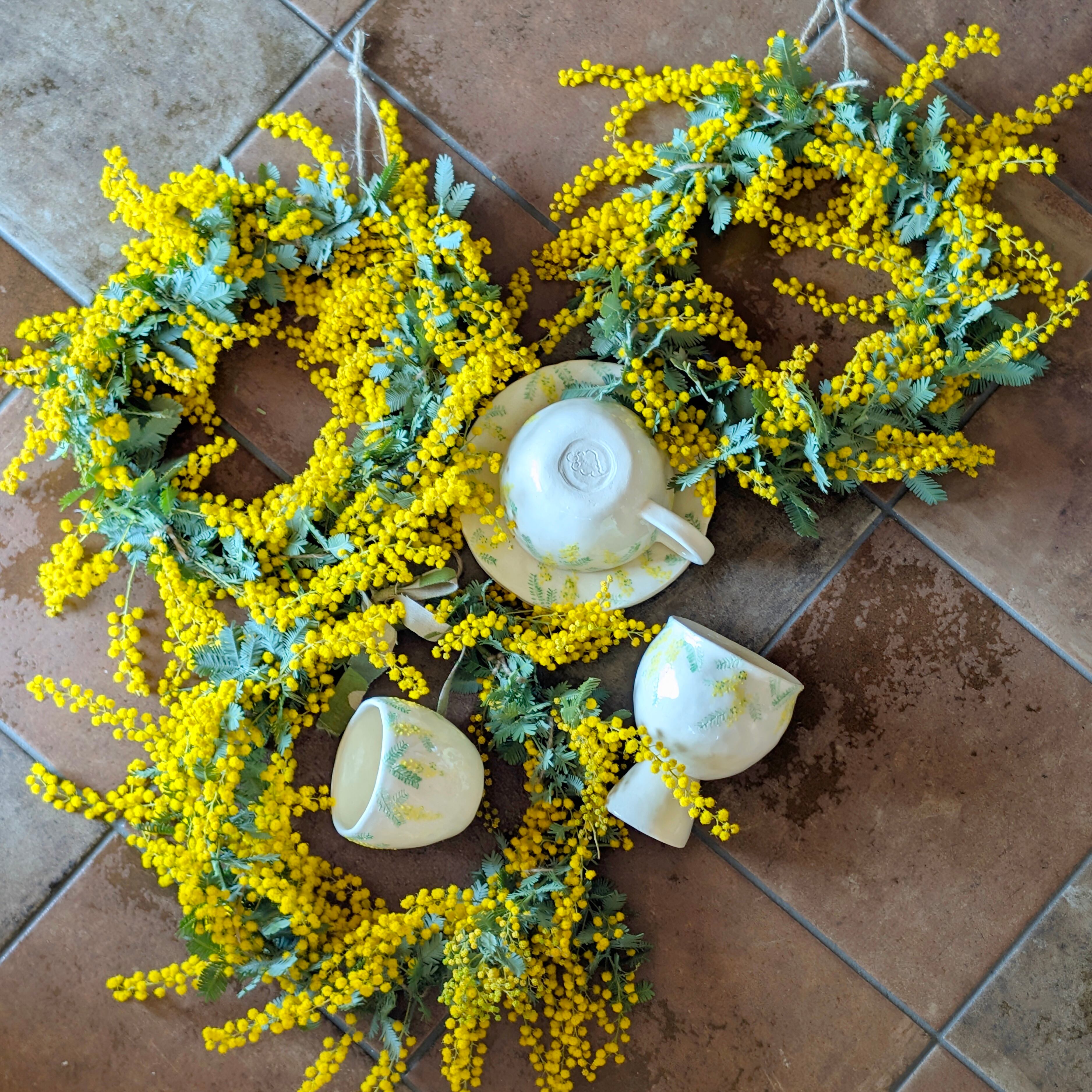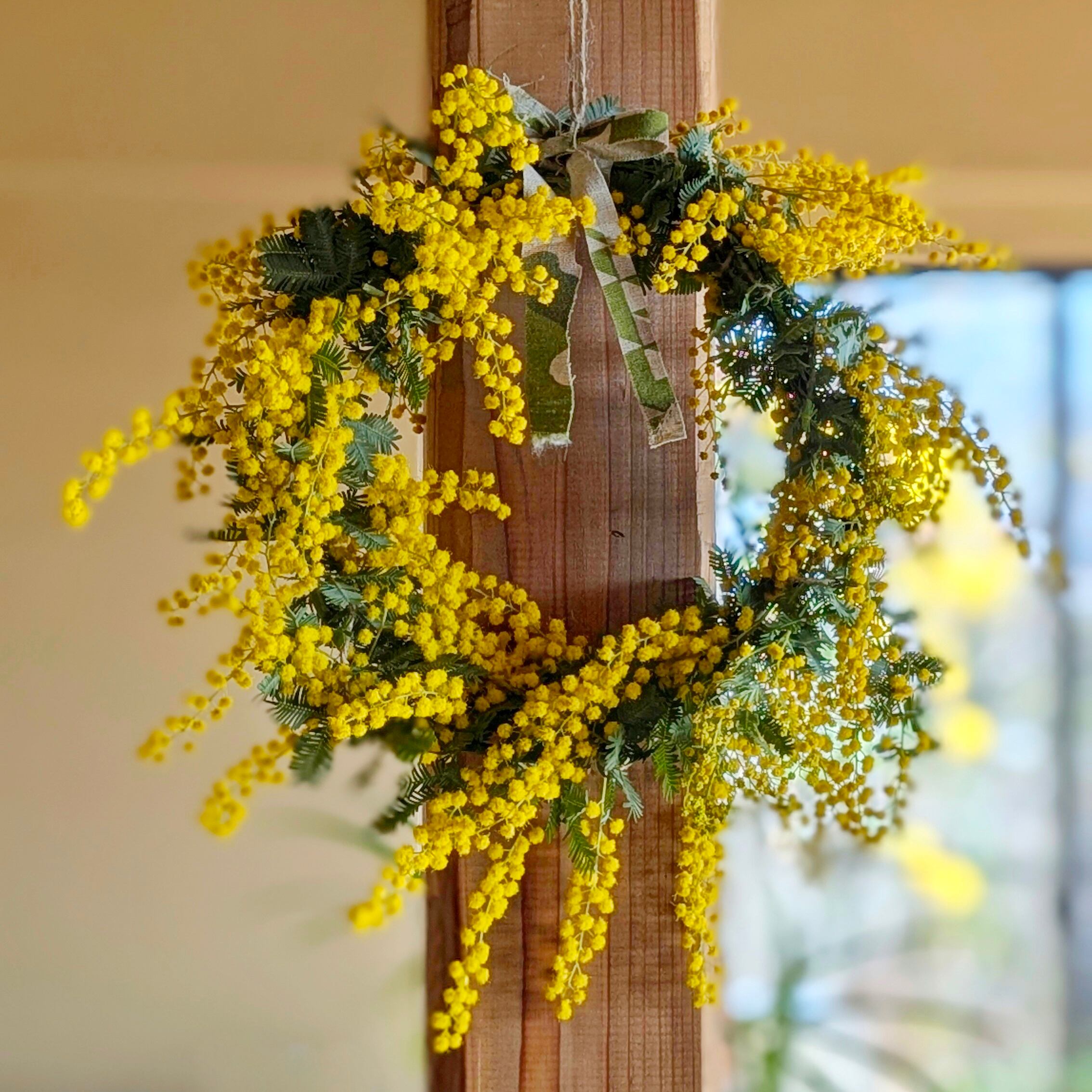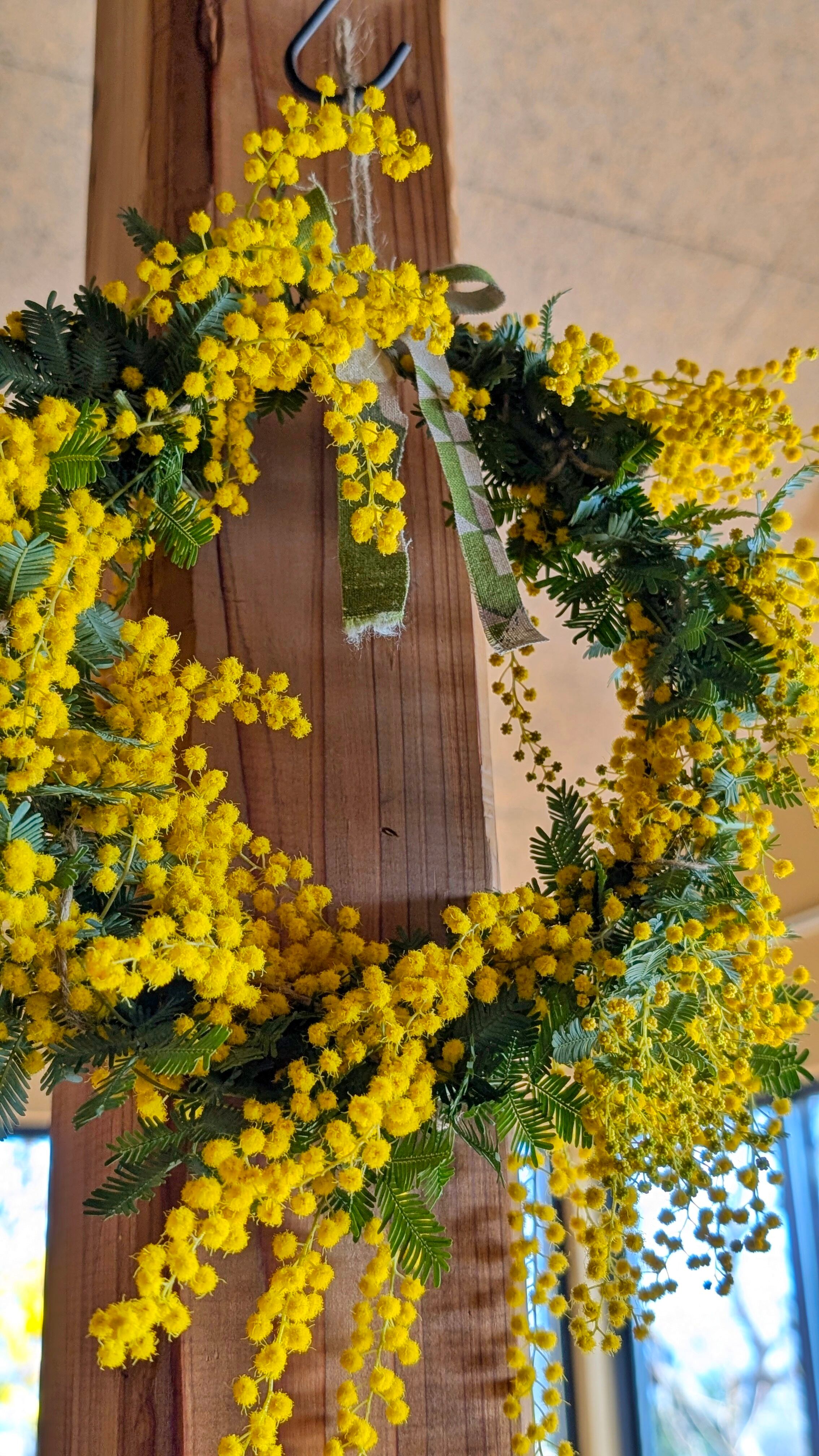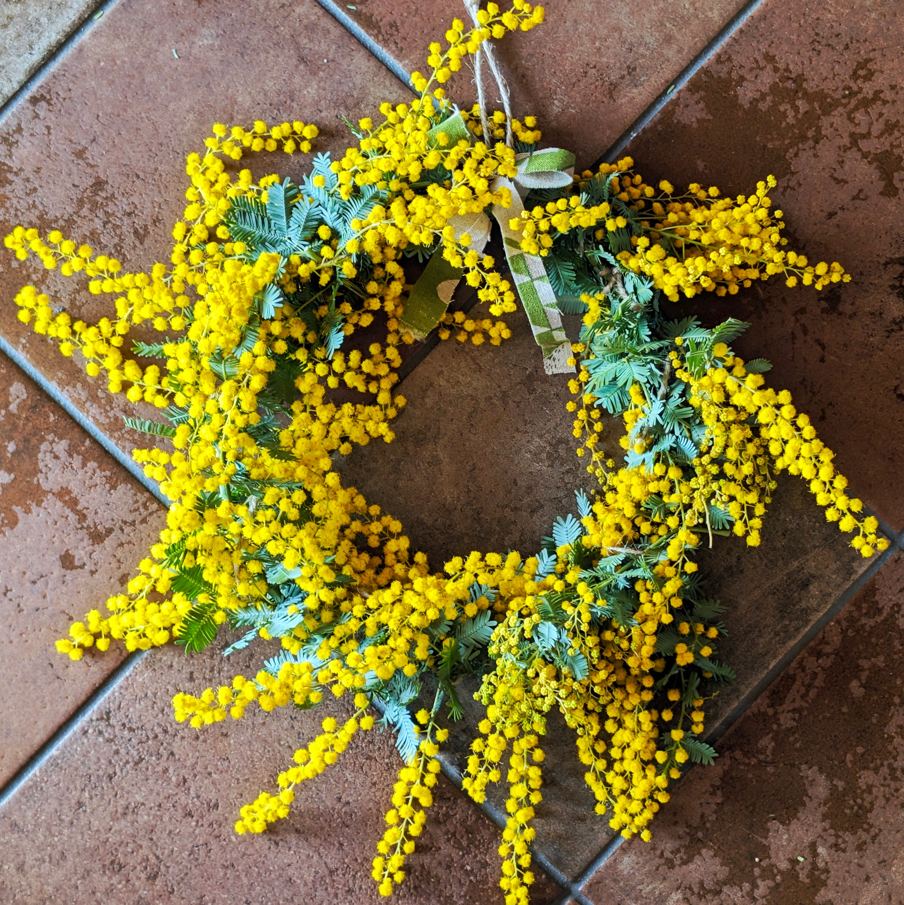 素材: 自家栽培ミモザ(完全無農薬)、麻紐、天然素材土台