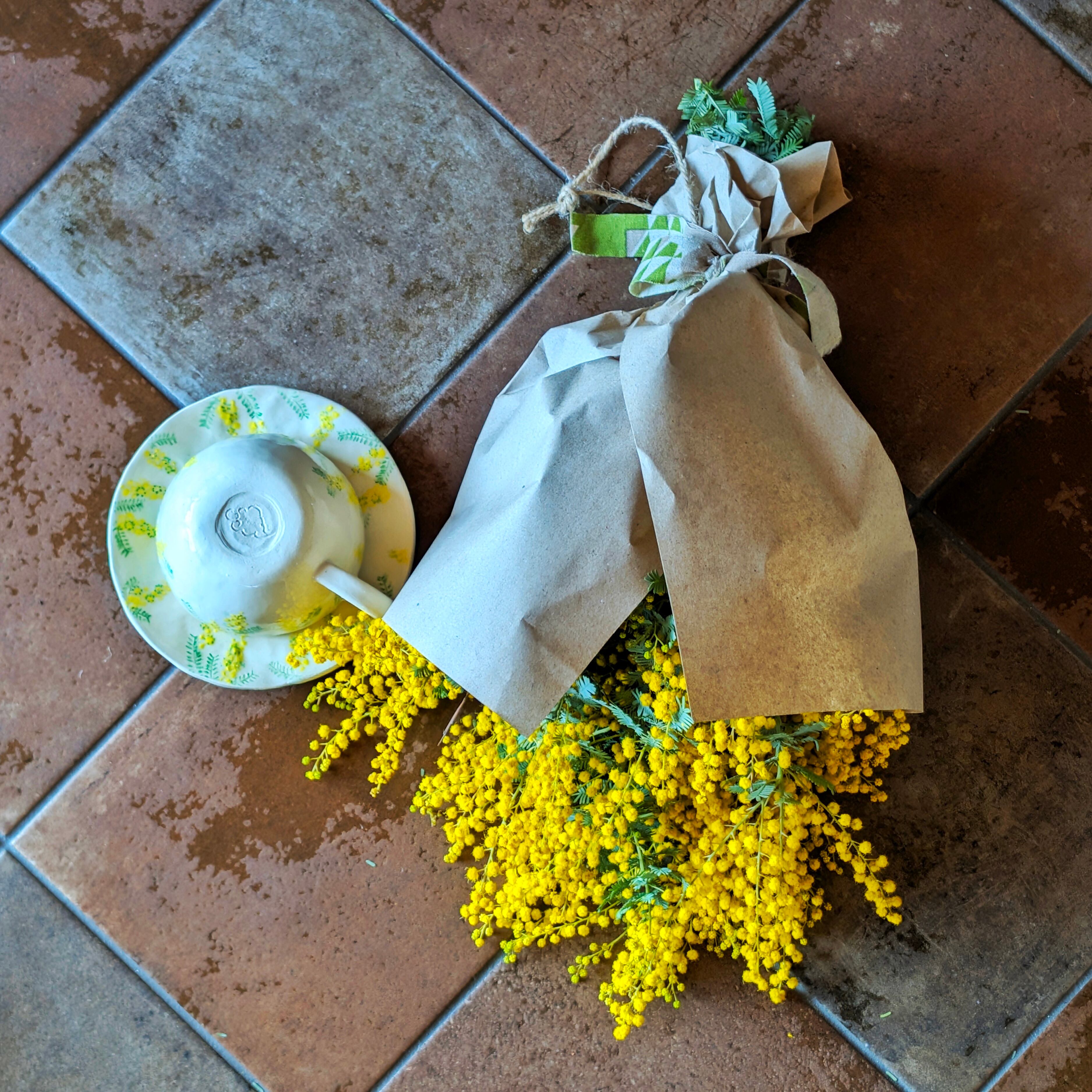 自家庭園で農薬を使わずに育てたミモザのみを厳選し、土台から結束に使う麻紐にいたるまで、すべて土に還る天然素材だけで仕立てました。