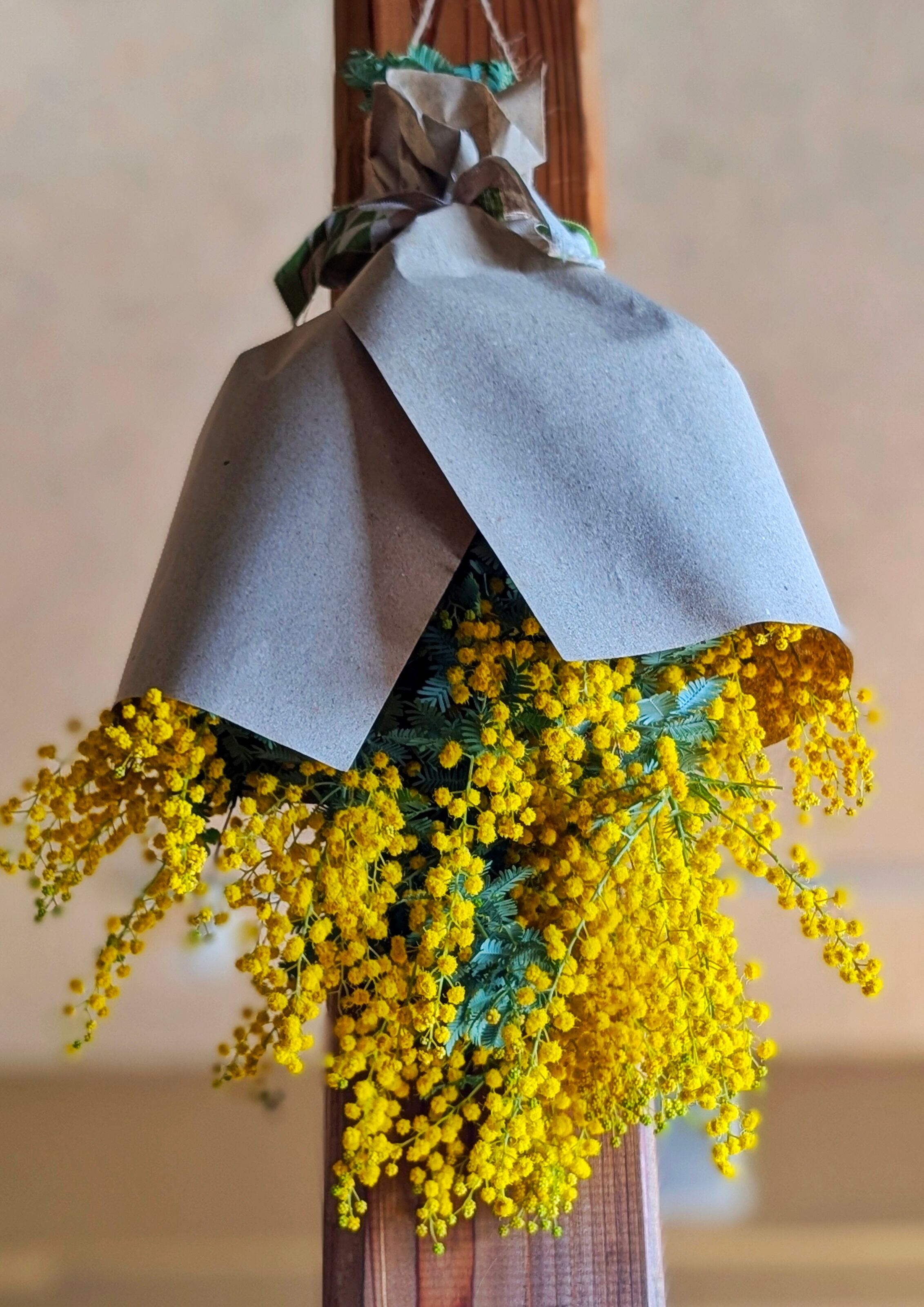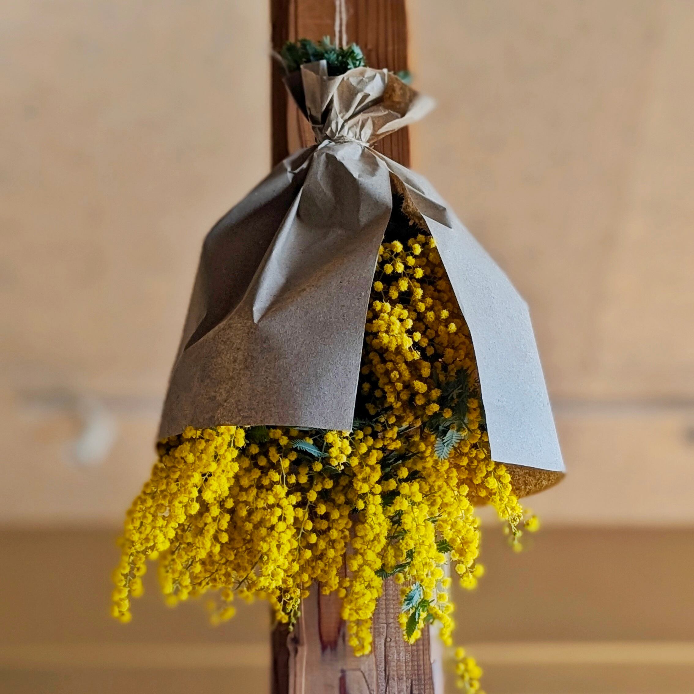 素材: 自家栽培ミモザ(完全無農薬)、麻紐、天然素材土台