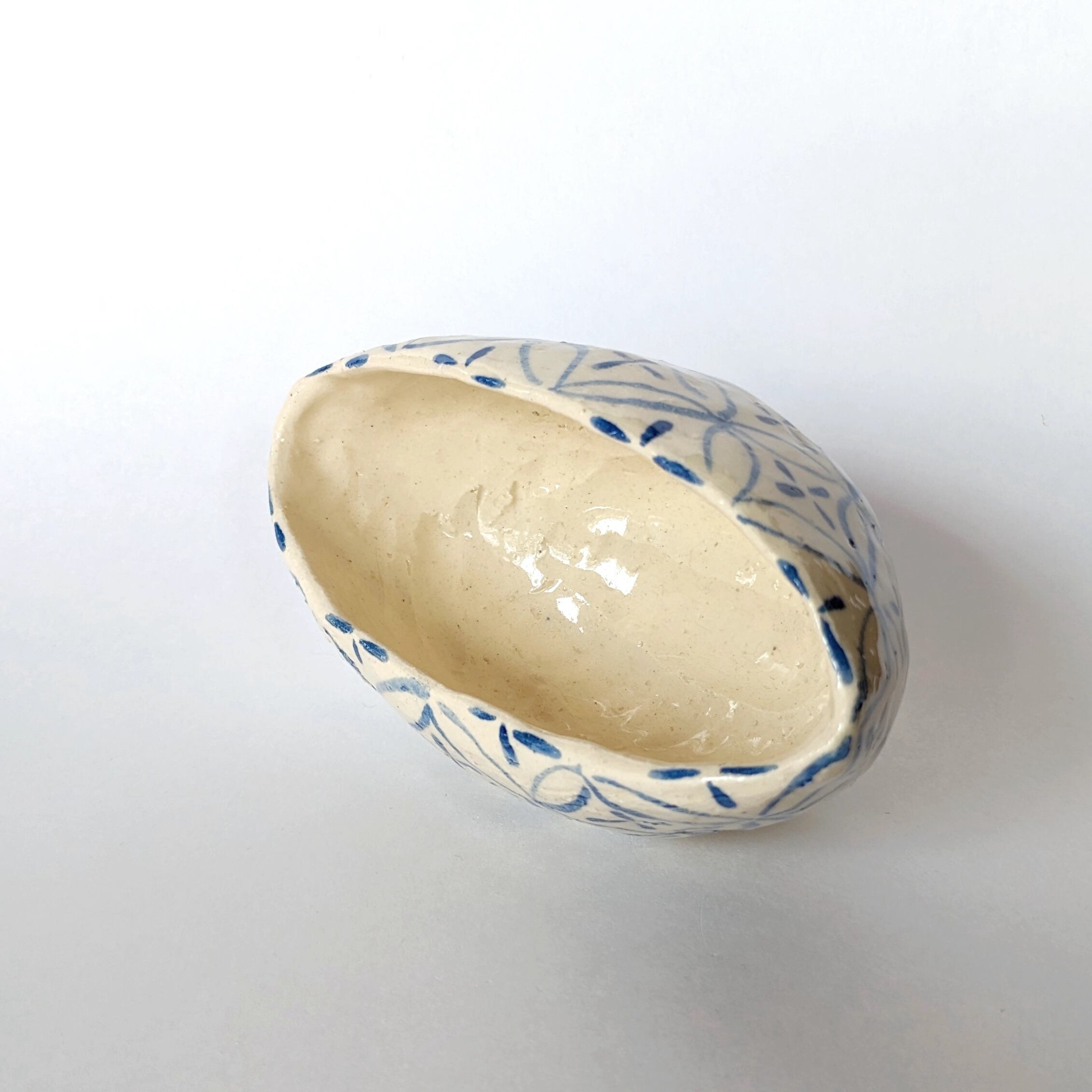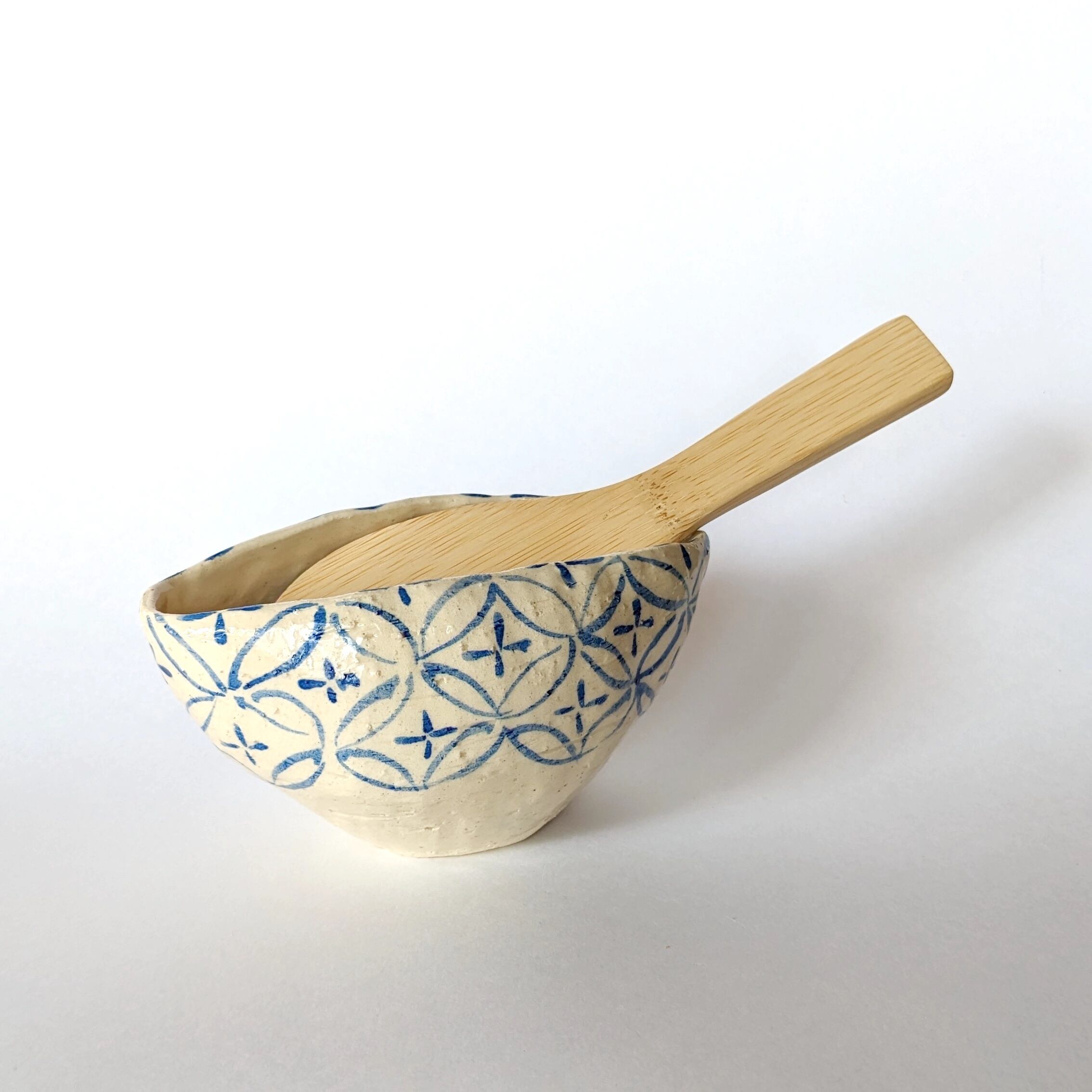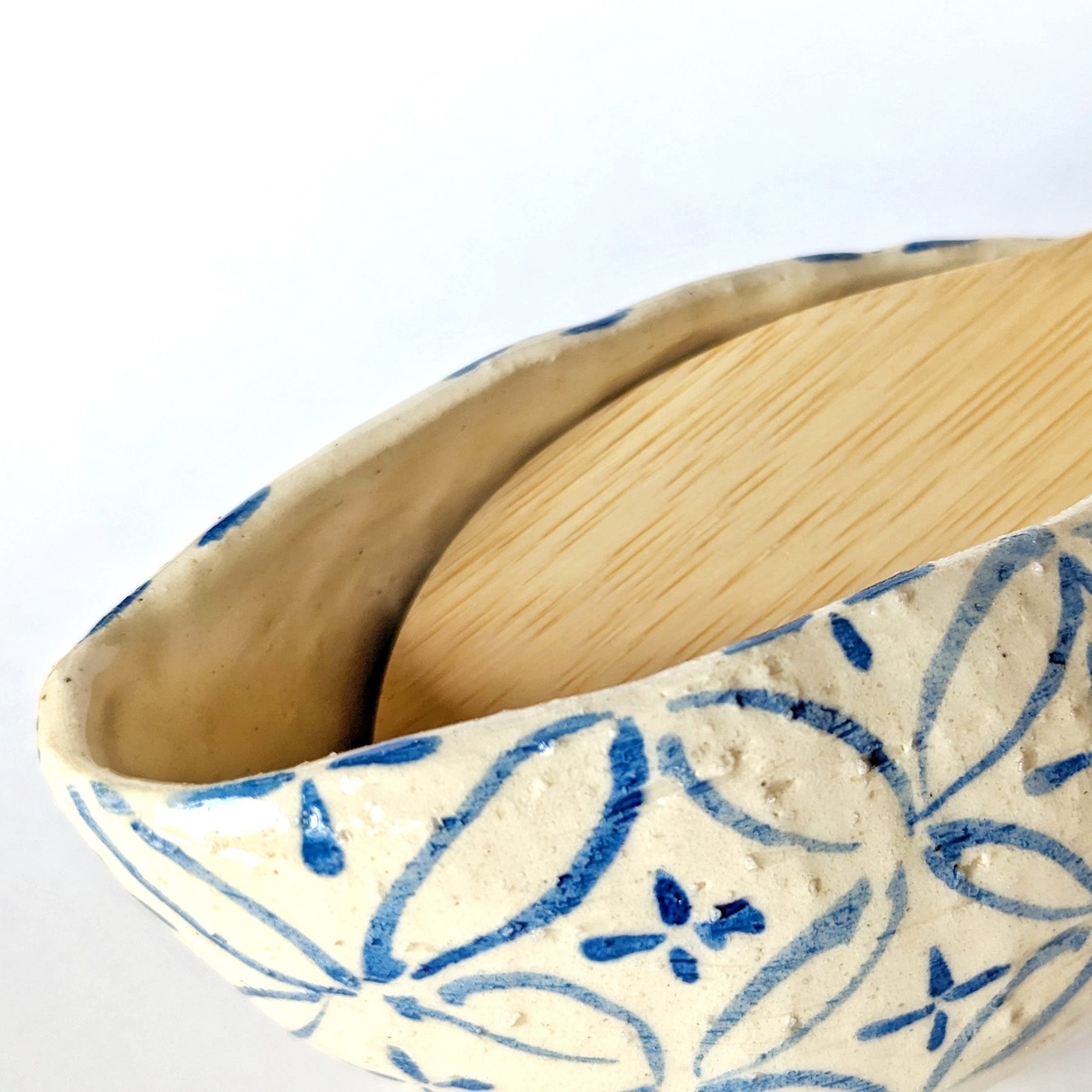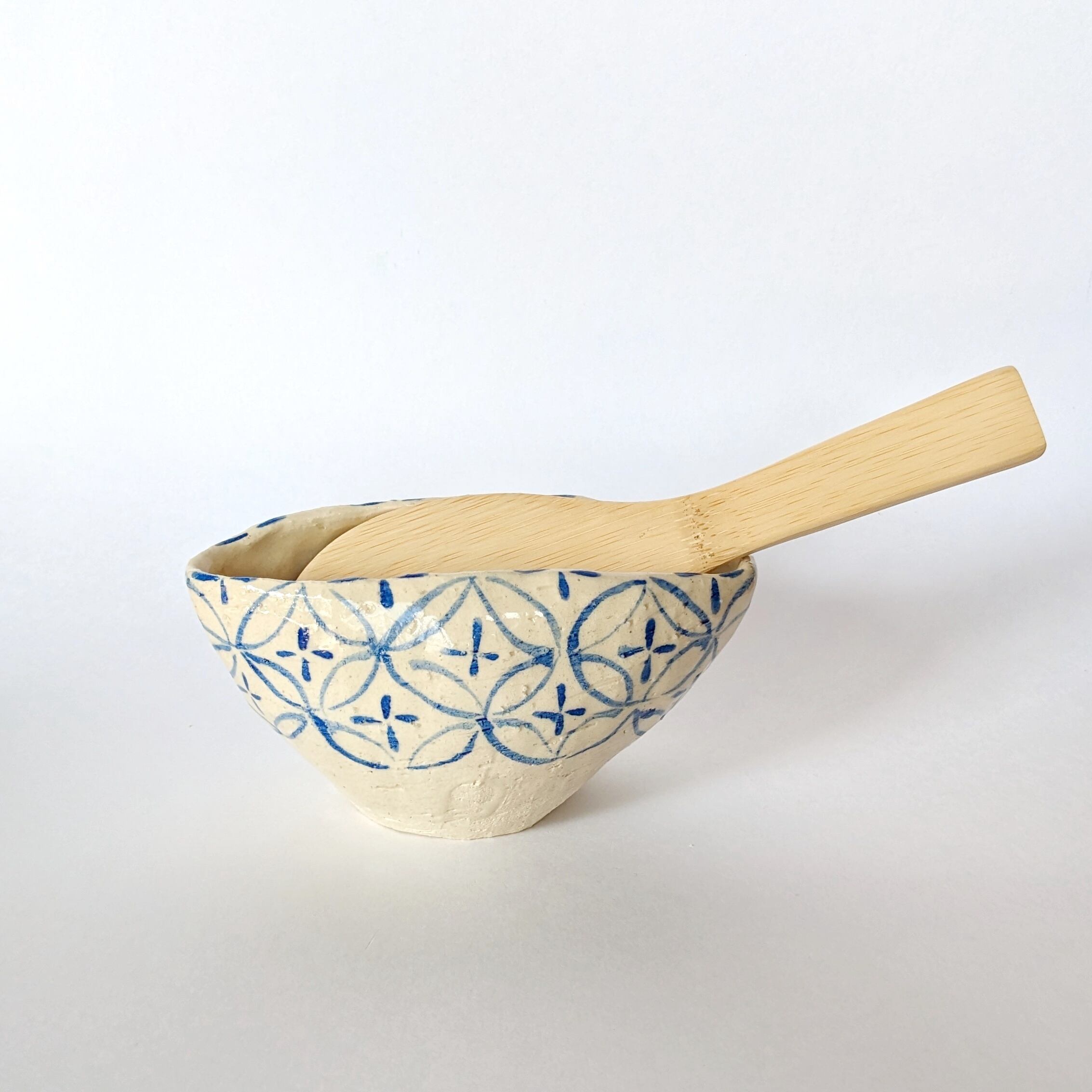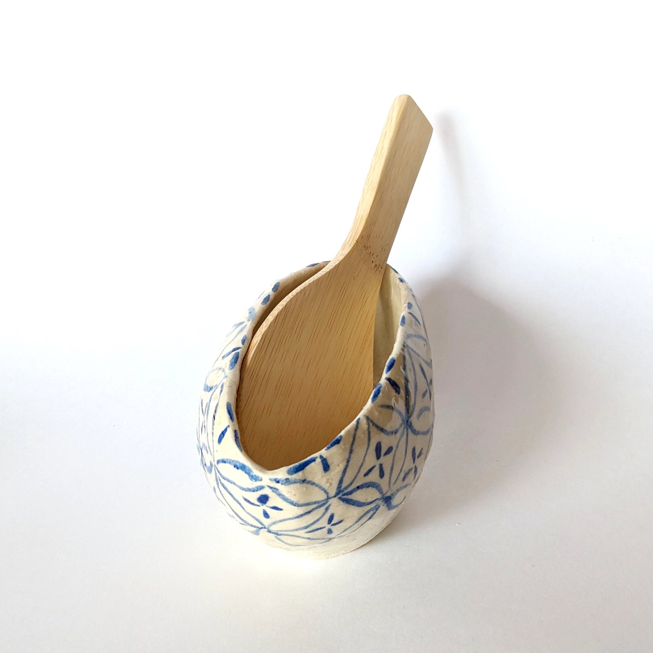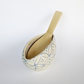 七宝のしゃもじ立てはお客様からのリクエストにより作成させていただきました。手びねりと楽焼の手法を使ってつくりました。底を重めにすることで安定感を高めています。