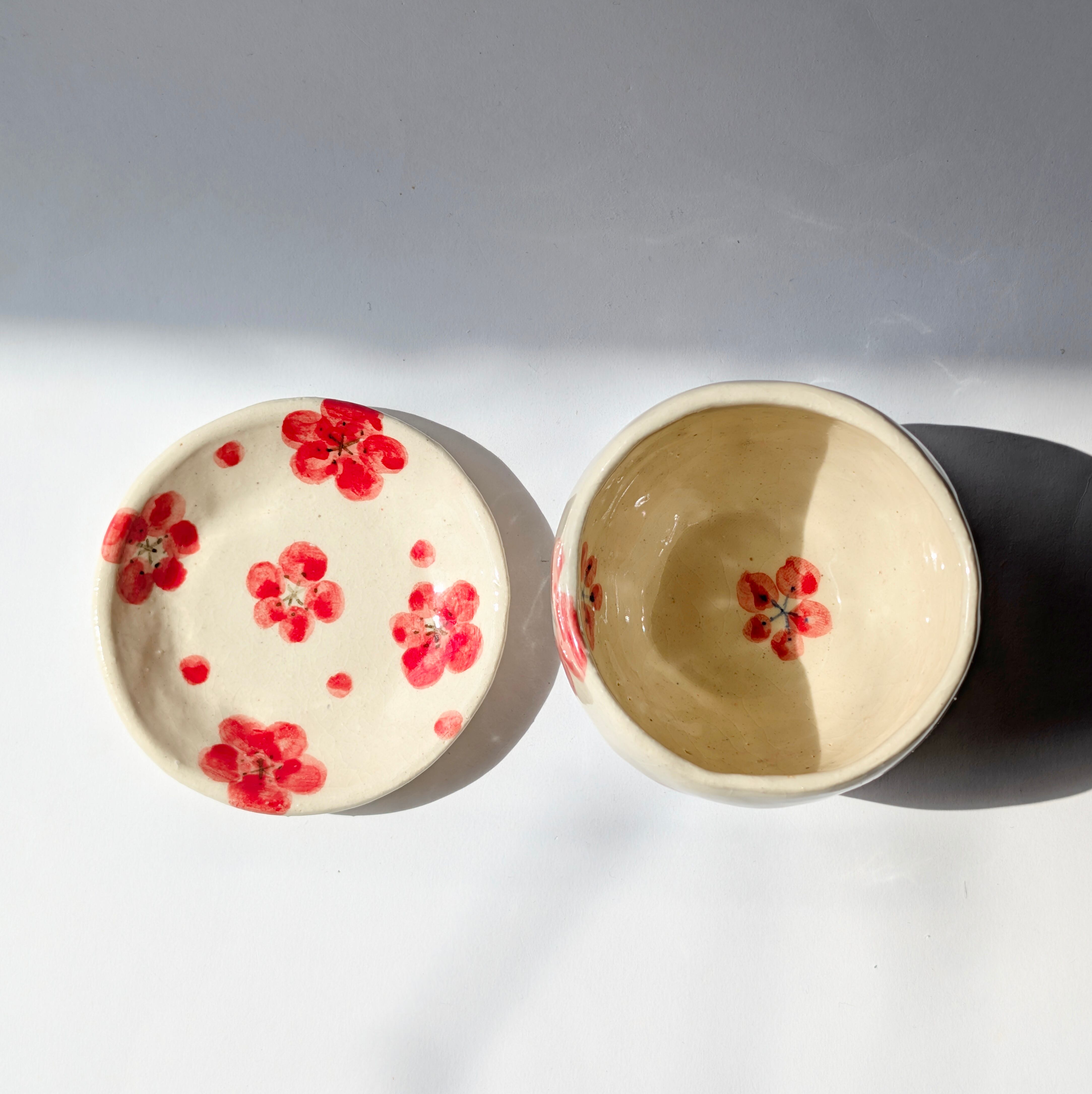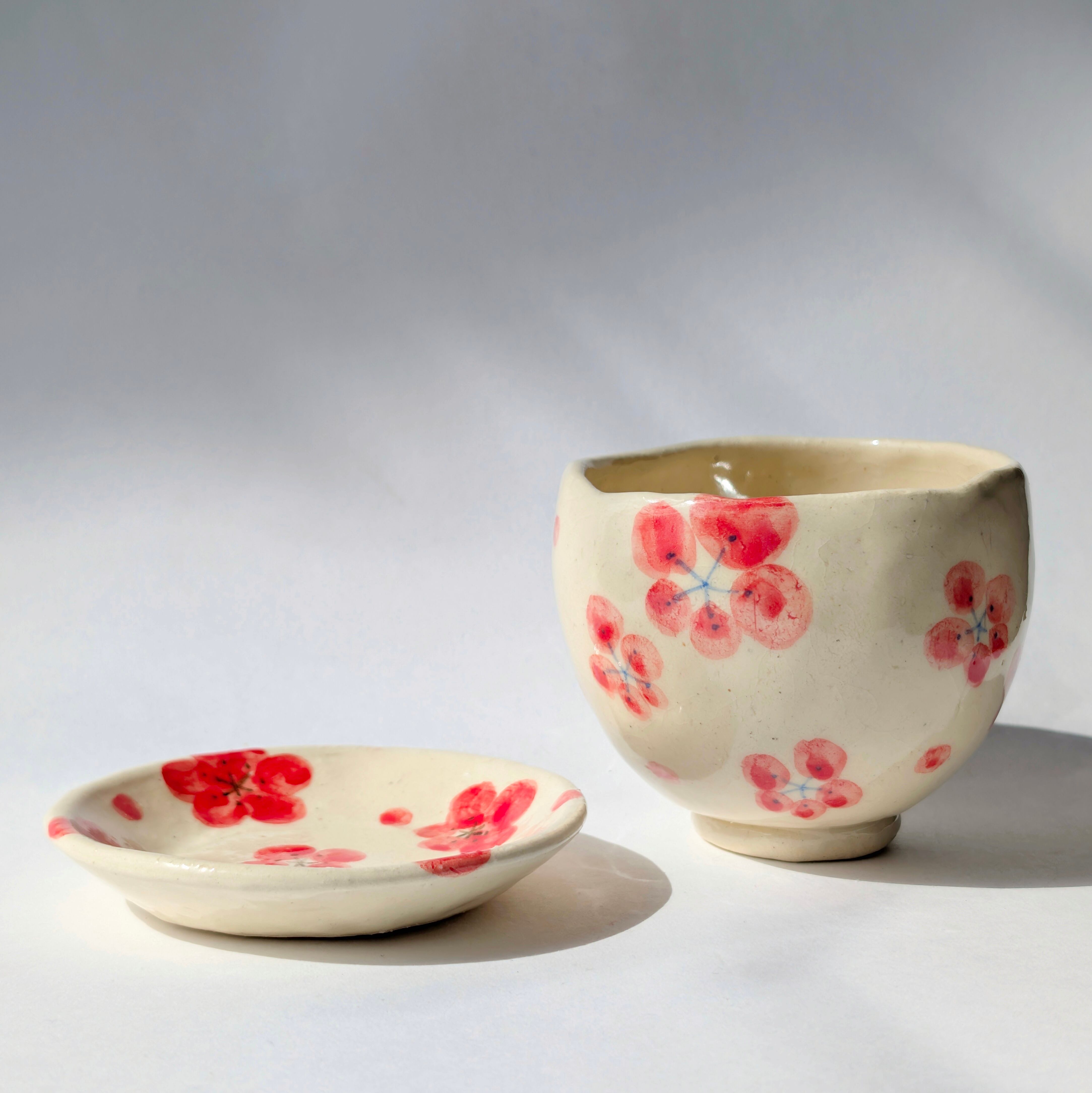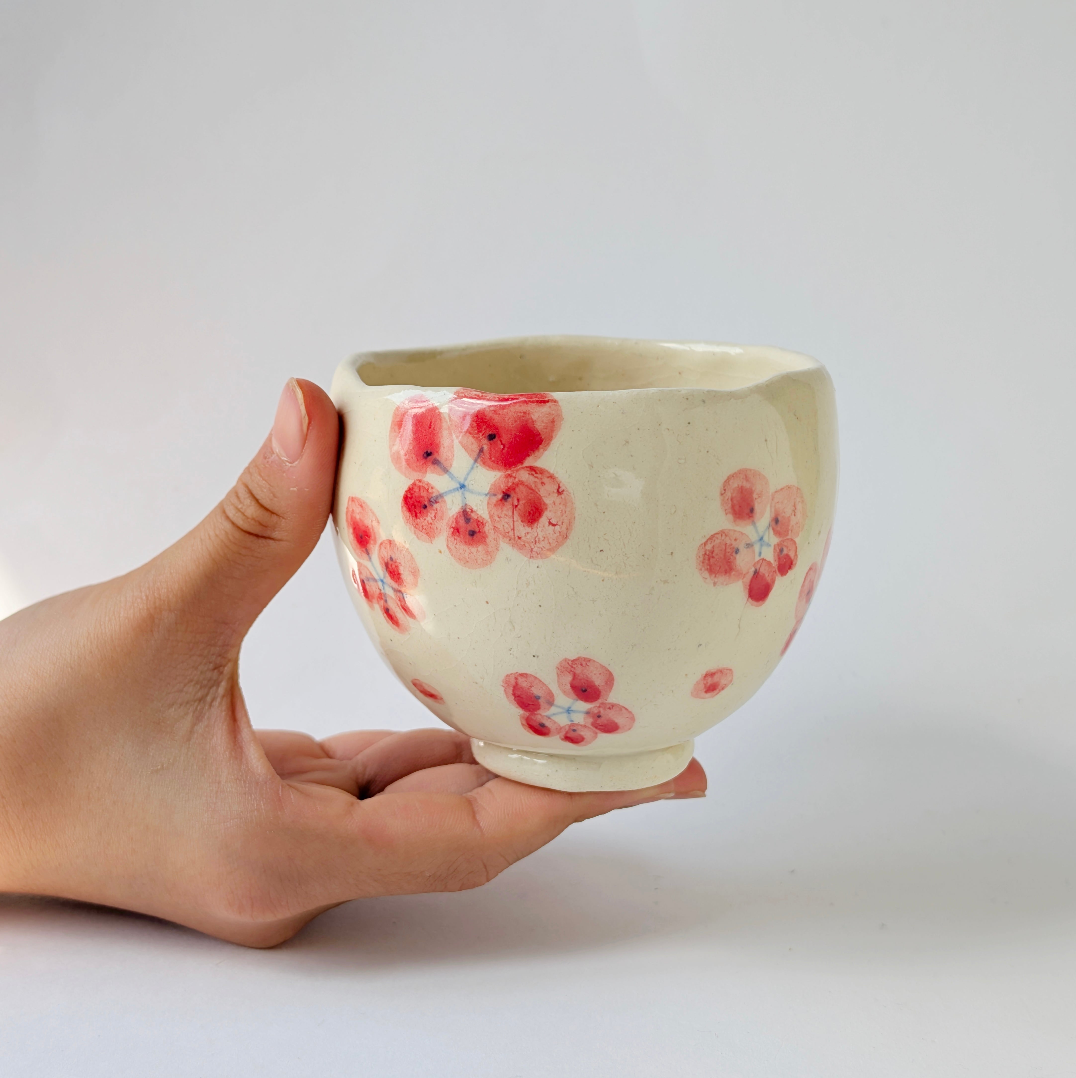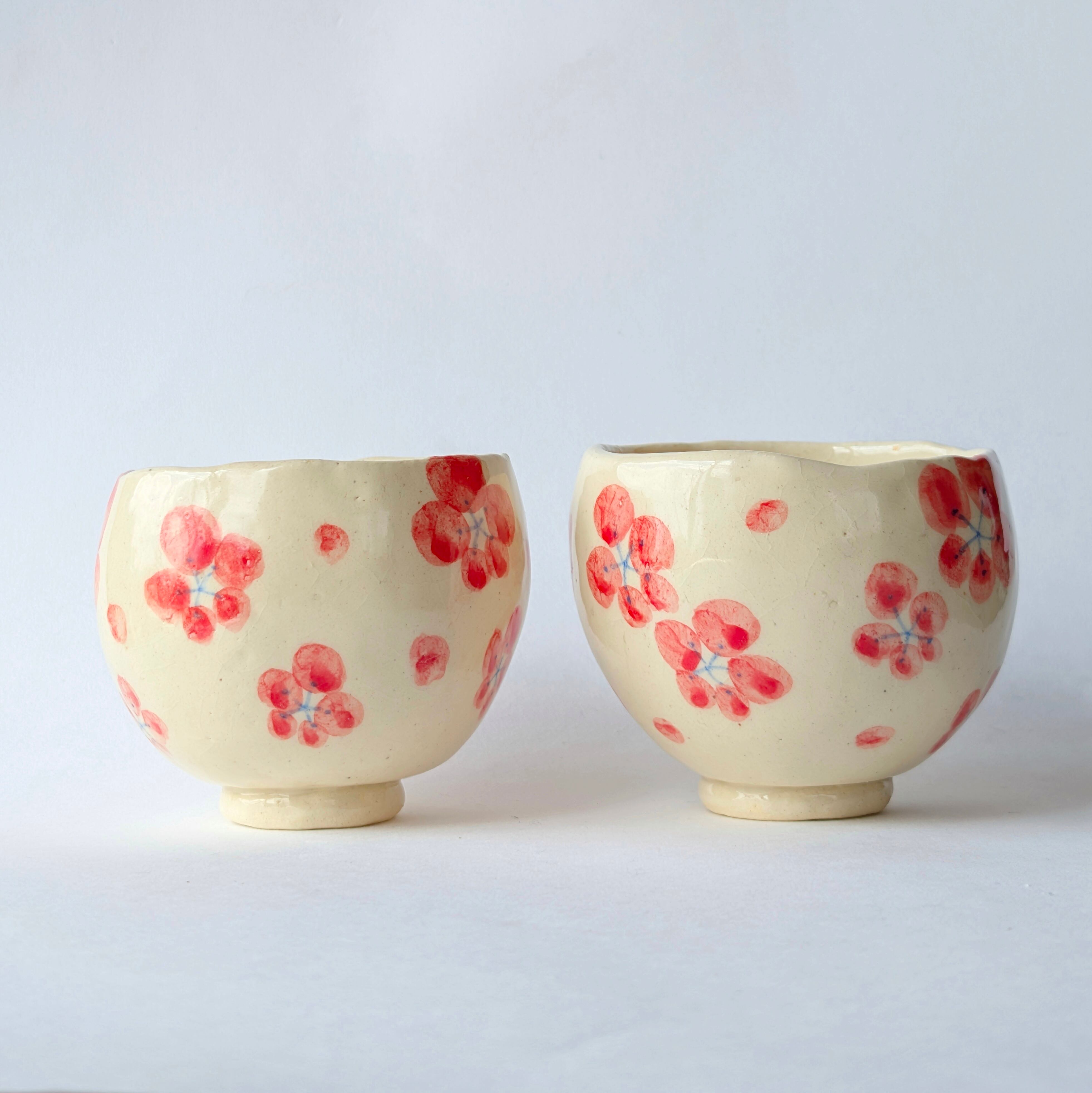 梅の花模様の湯呑みです。岡本梅林公園の梅をモチーフにして、手びねりと楽焼の手法をもちいて作りました。内側もかんなで削る事ことによって、土の表情をより身近に感じていただけます。