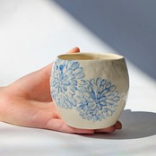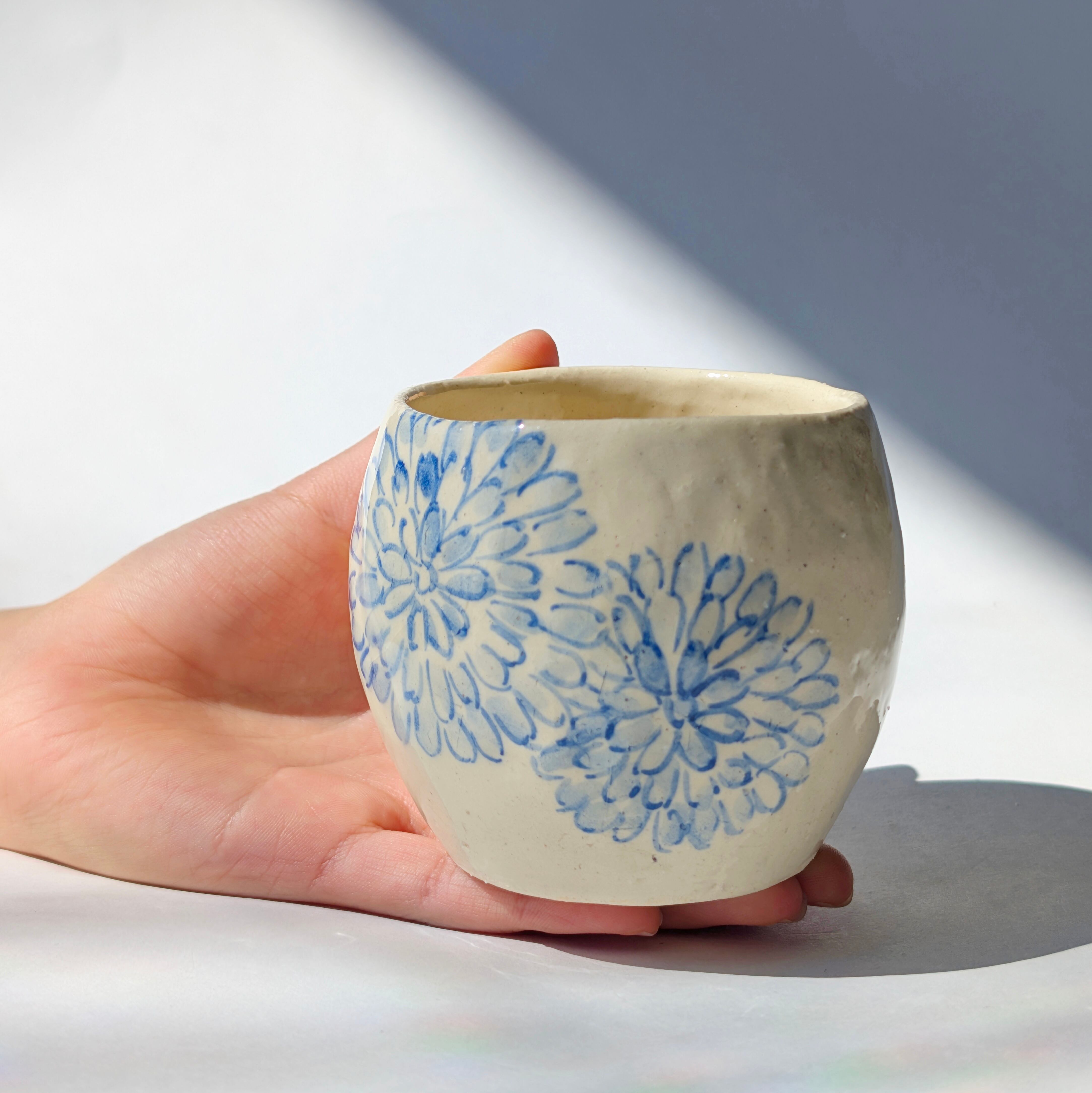 手のひらにすっぽり収まる、大胆に咲き誇る大輪の菊の花が印象的な湯呑み。