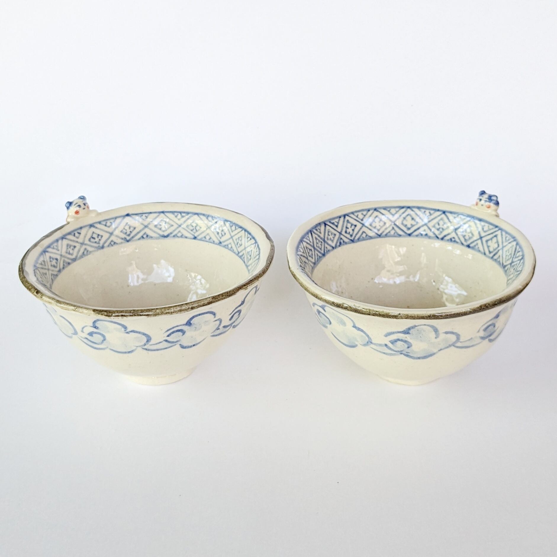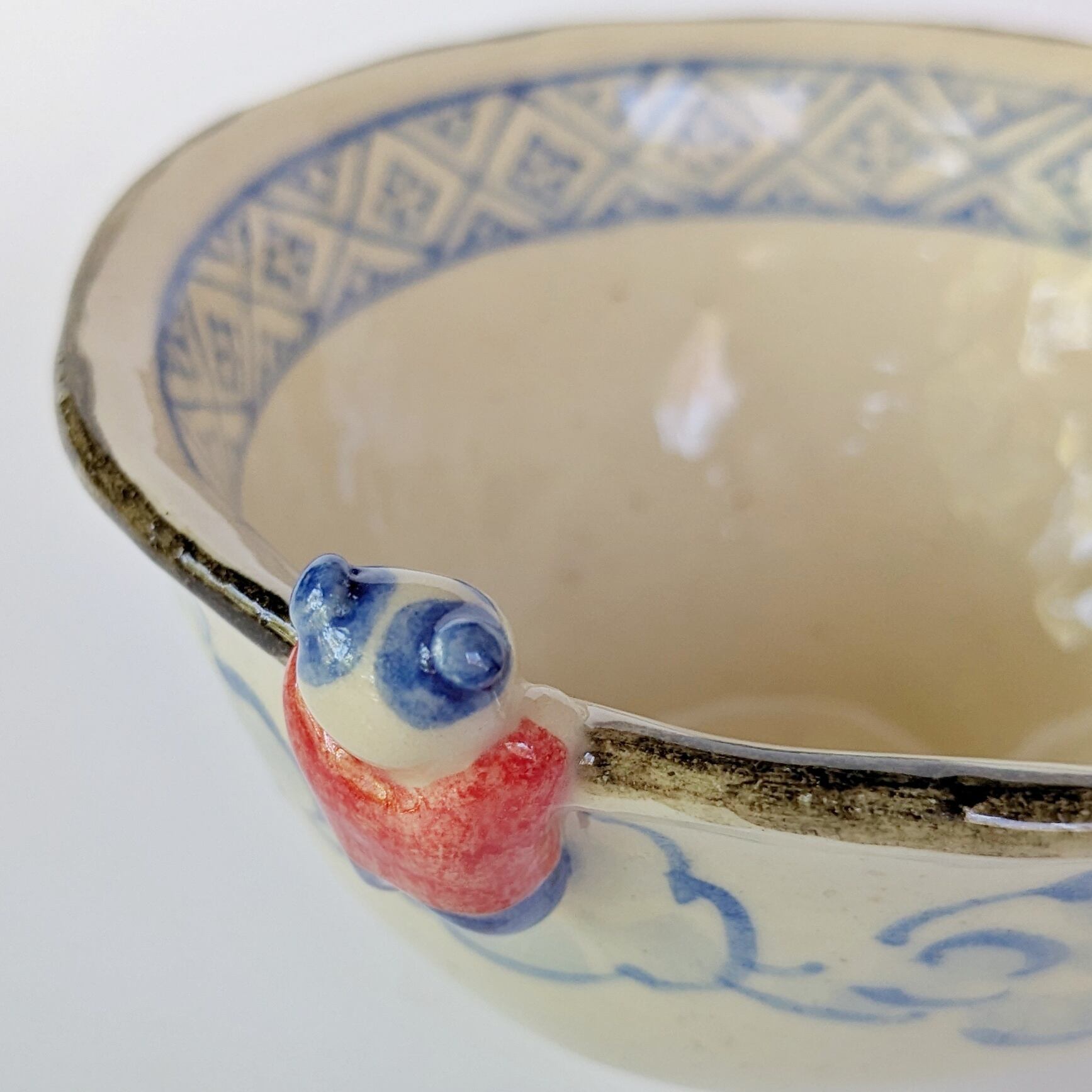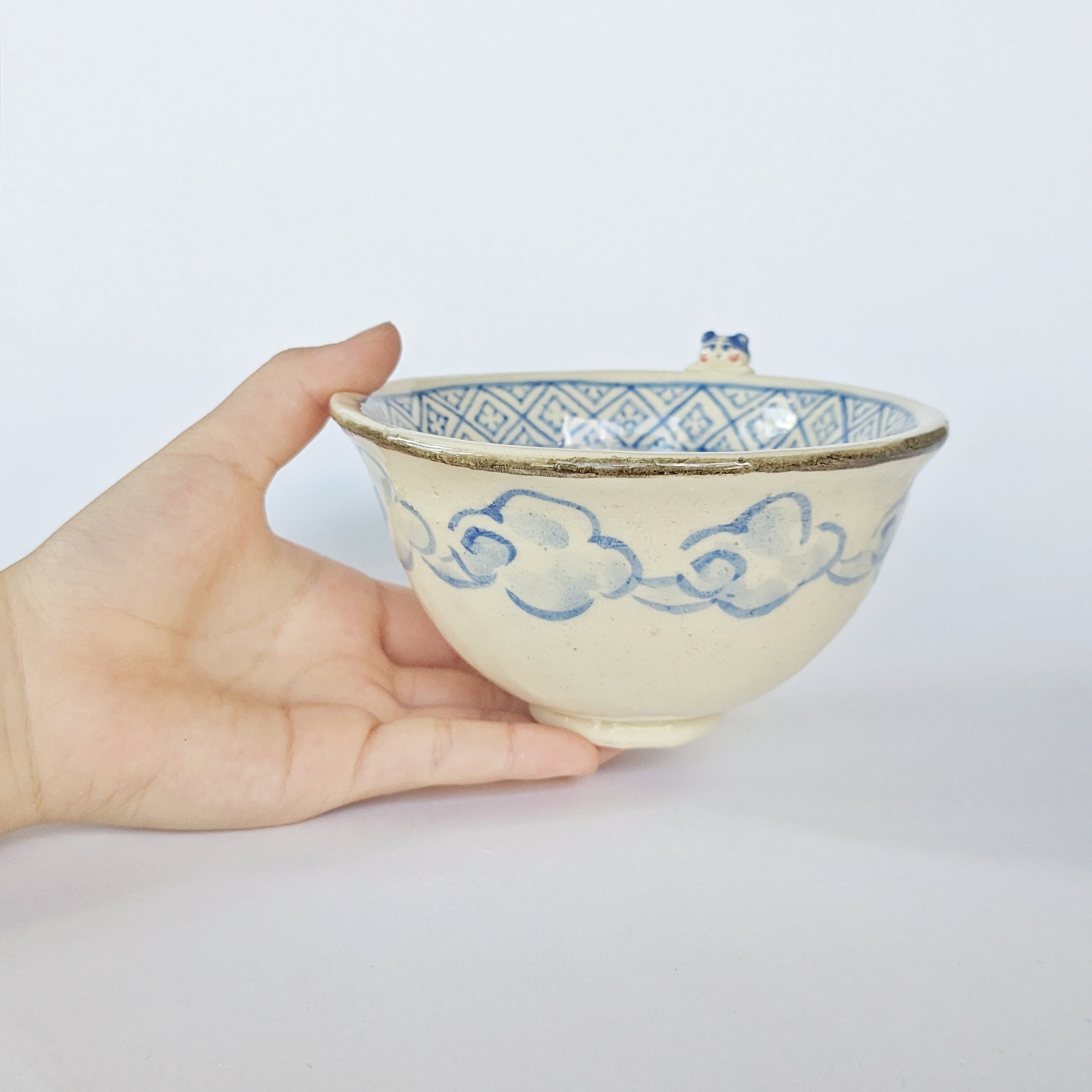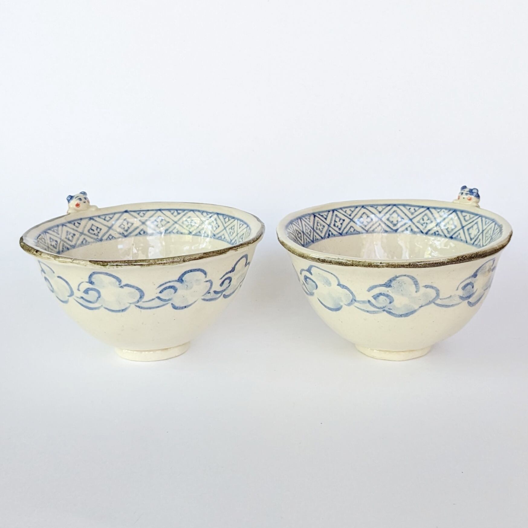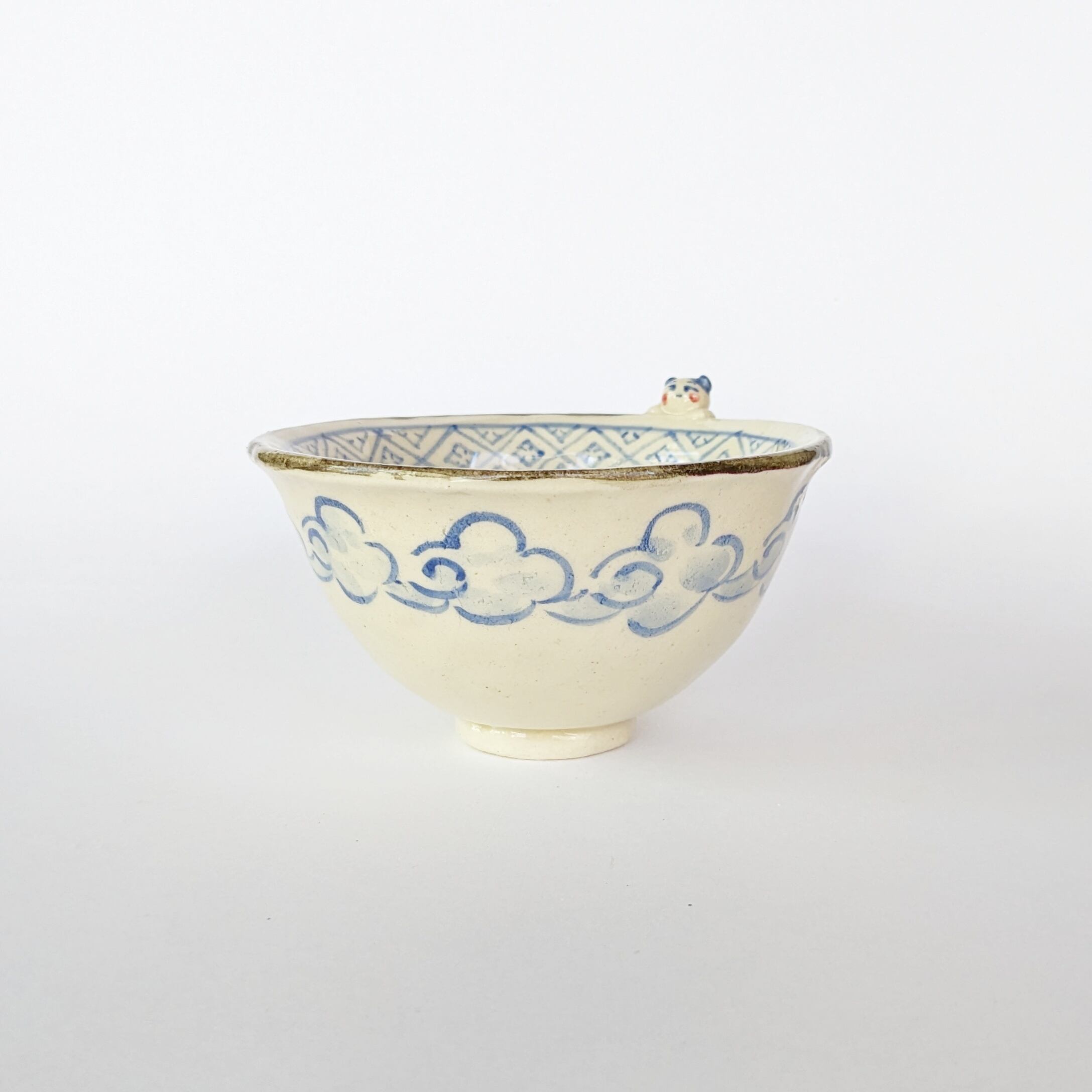 新作のうつわが登場しました。外側には、しののめラボのモチーフである雲の模様が描かれ繊細な雰囲気を漂わせています。さらに、うつわのフチには中国の伝統的なモチーフである唐子がかわいらしくぶら下がっており、遊び心あふれるデザインになっています。