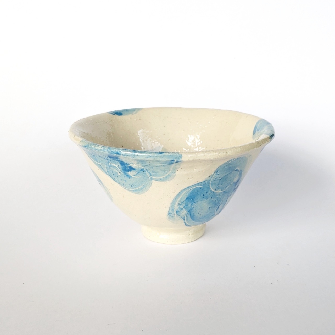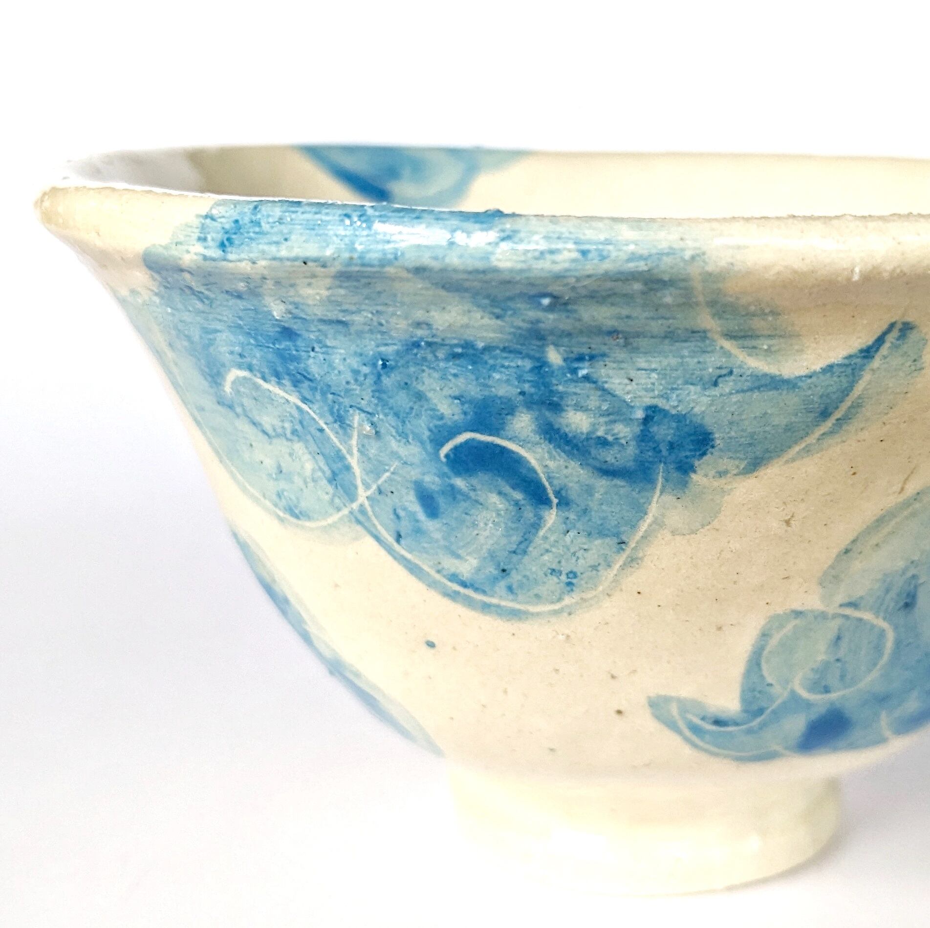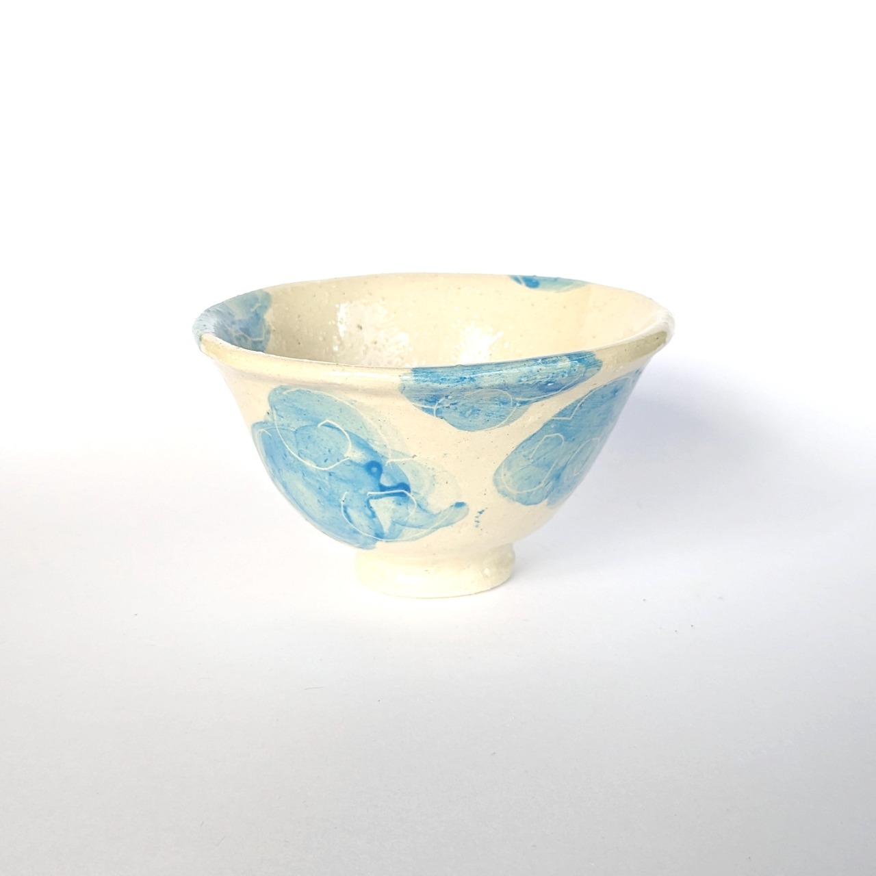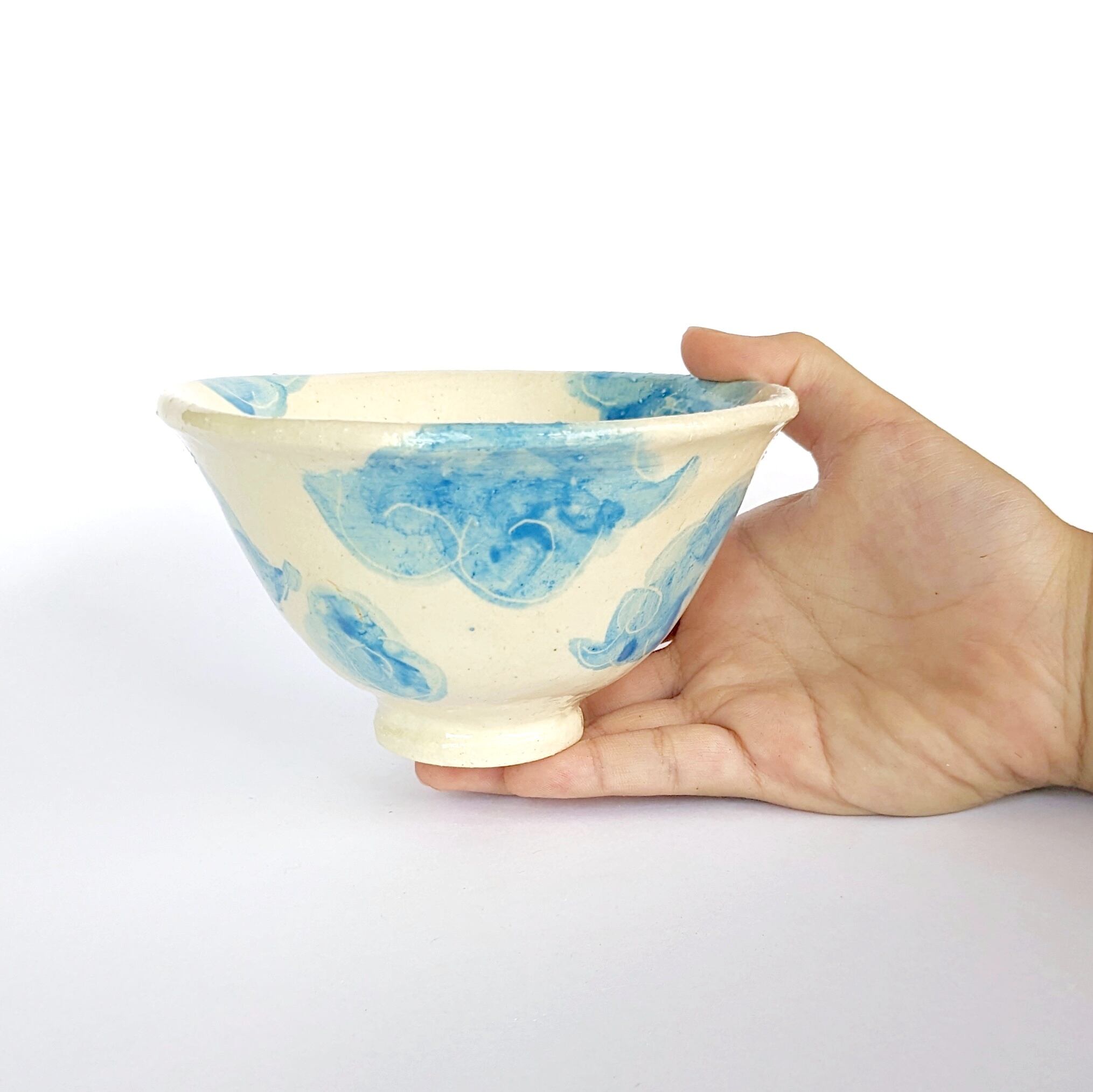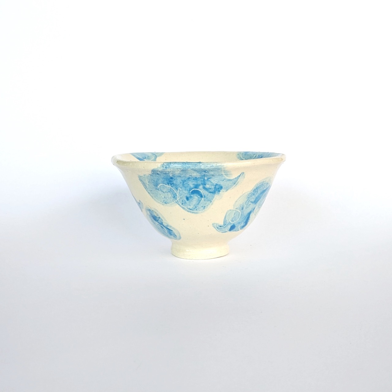 爽やかなターコイズブルーを使って雲の絵を描いたご飯茶碗をつくりました。和風っぽいとみせかけて洋風っぽくもある独特のたたずまいになりました。