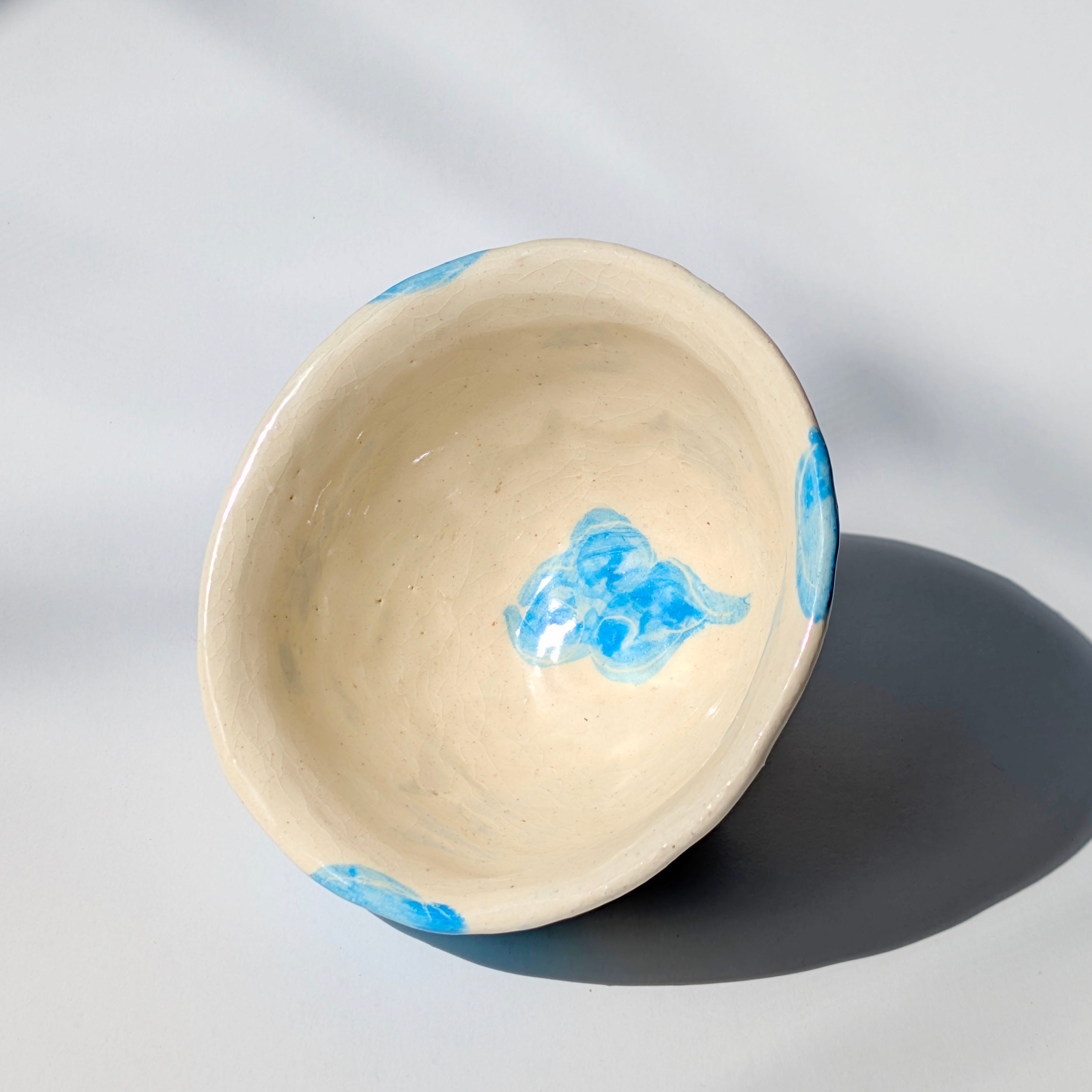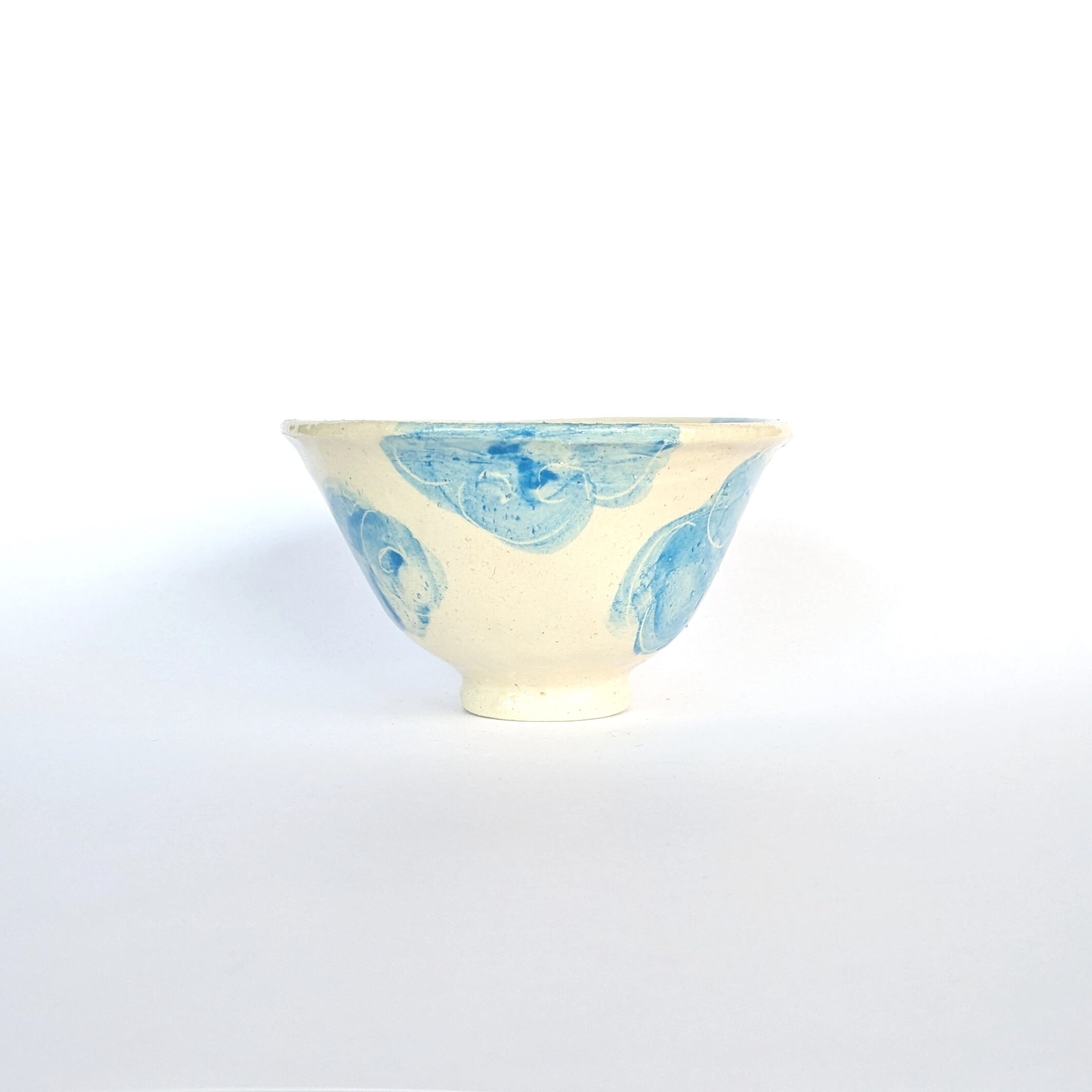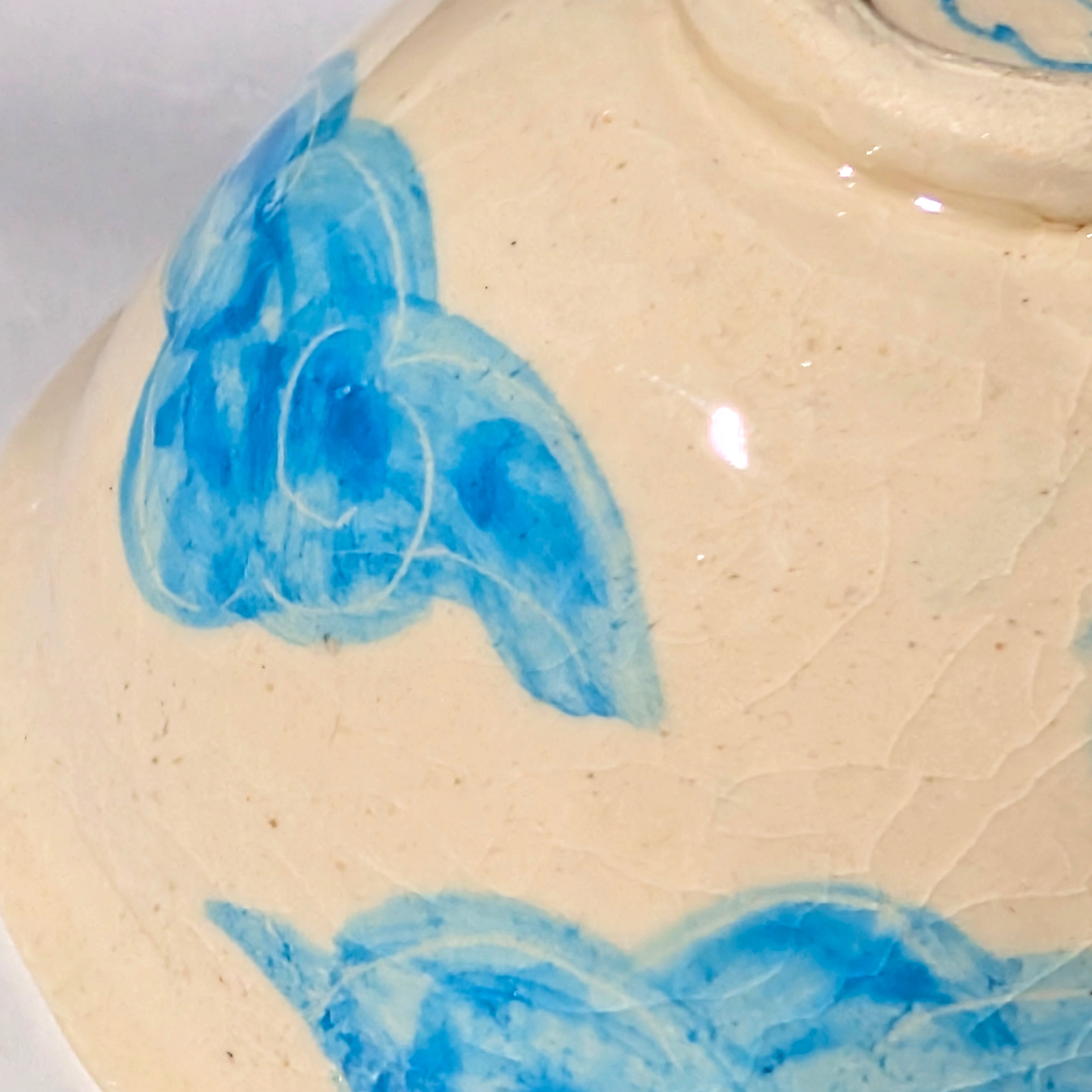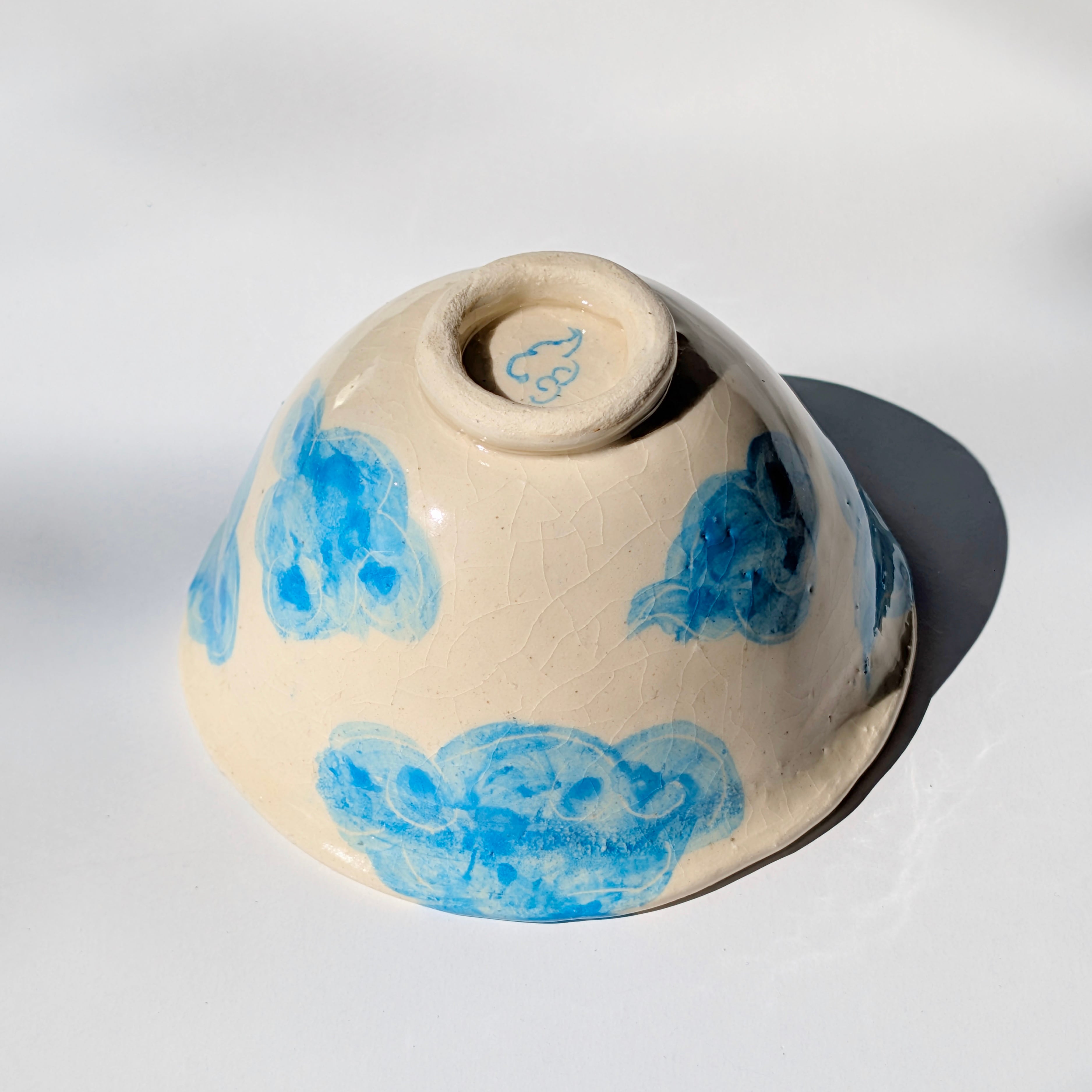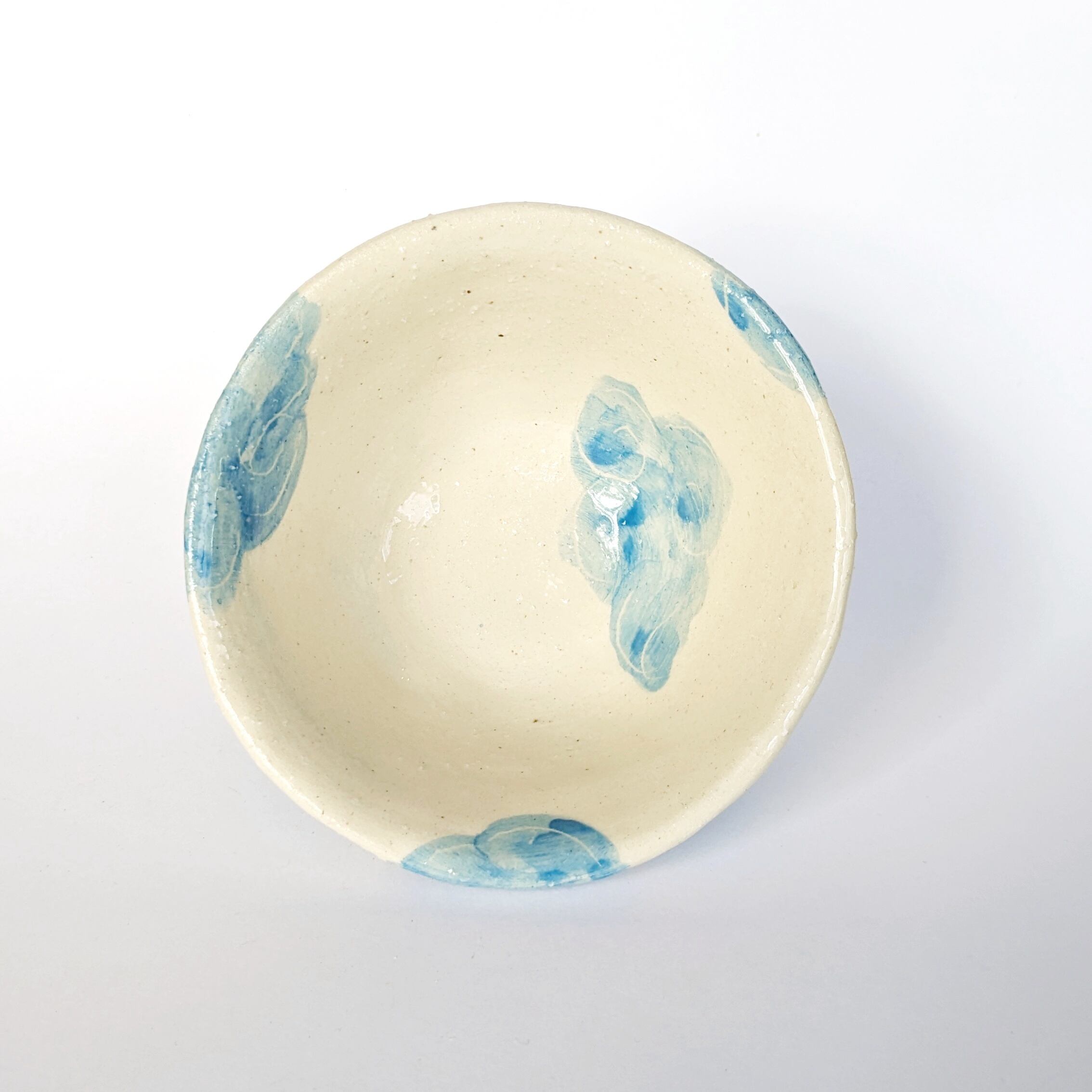 爽やかなターコイズブルーを使って雲の絵を描いたご飯茶碗をつくりました。和風っぽいとみせかけて洋風っぽくもある独特のたたずまいになりました。