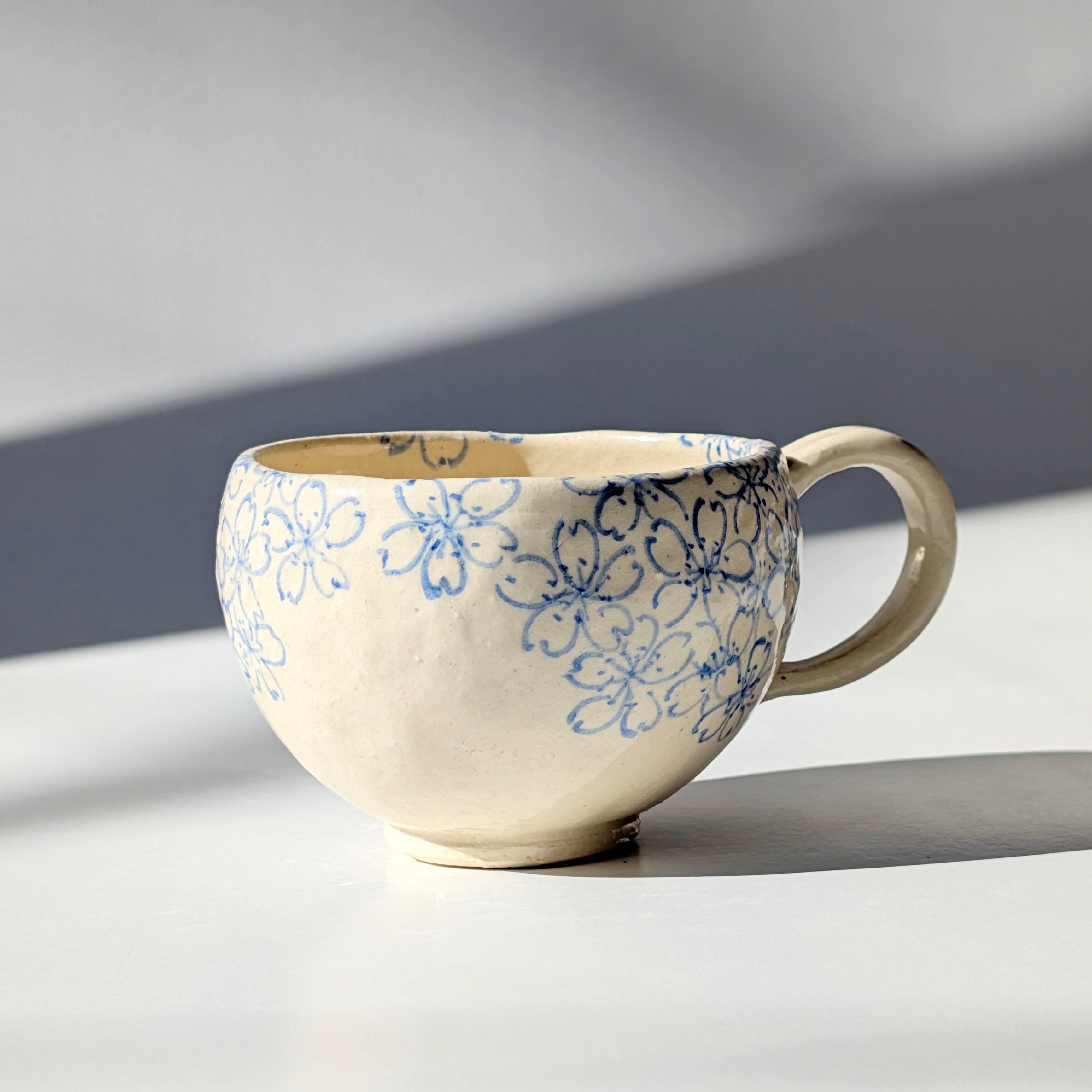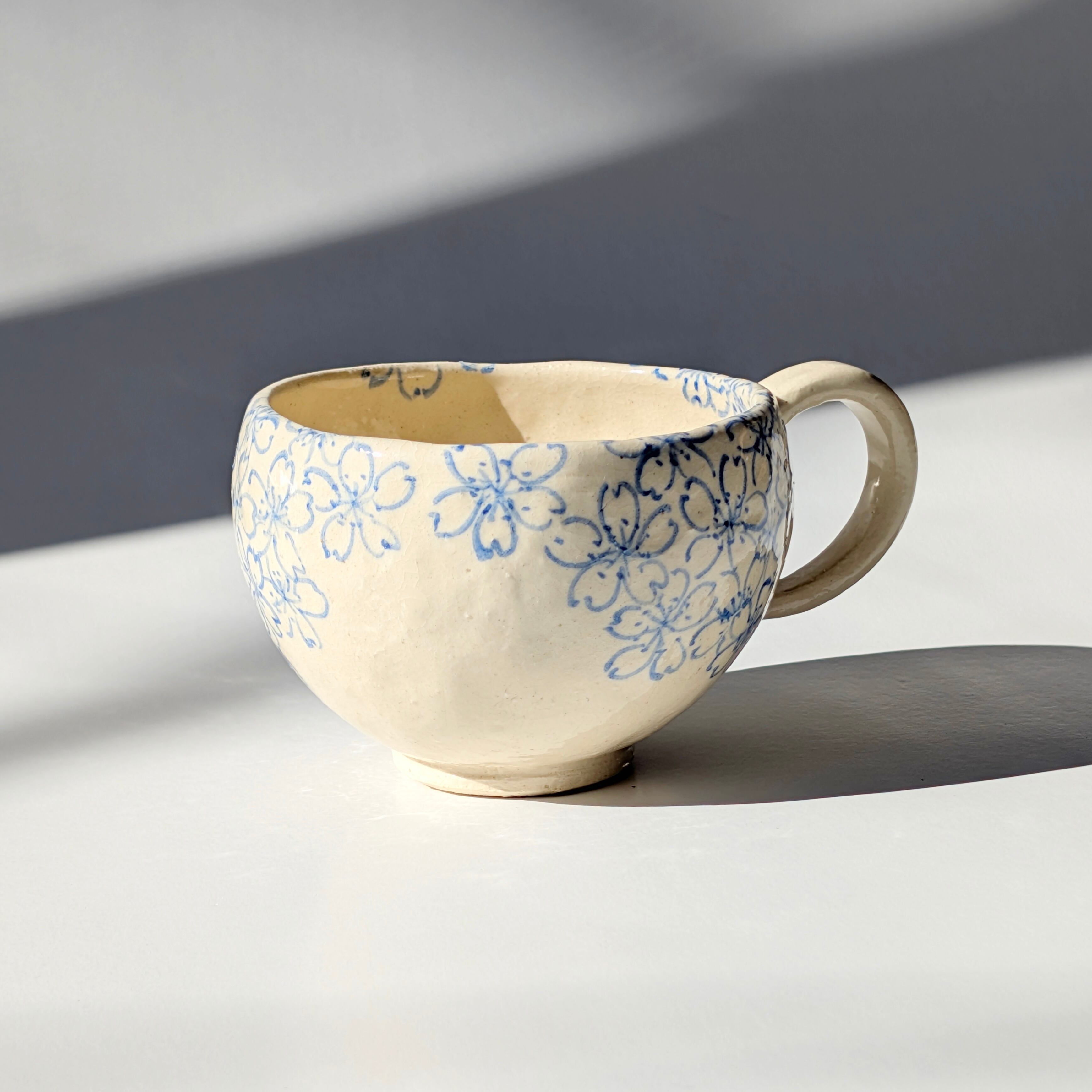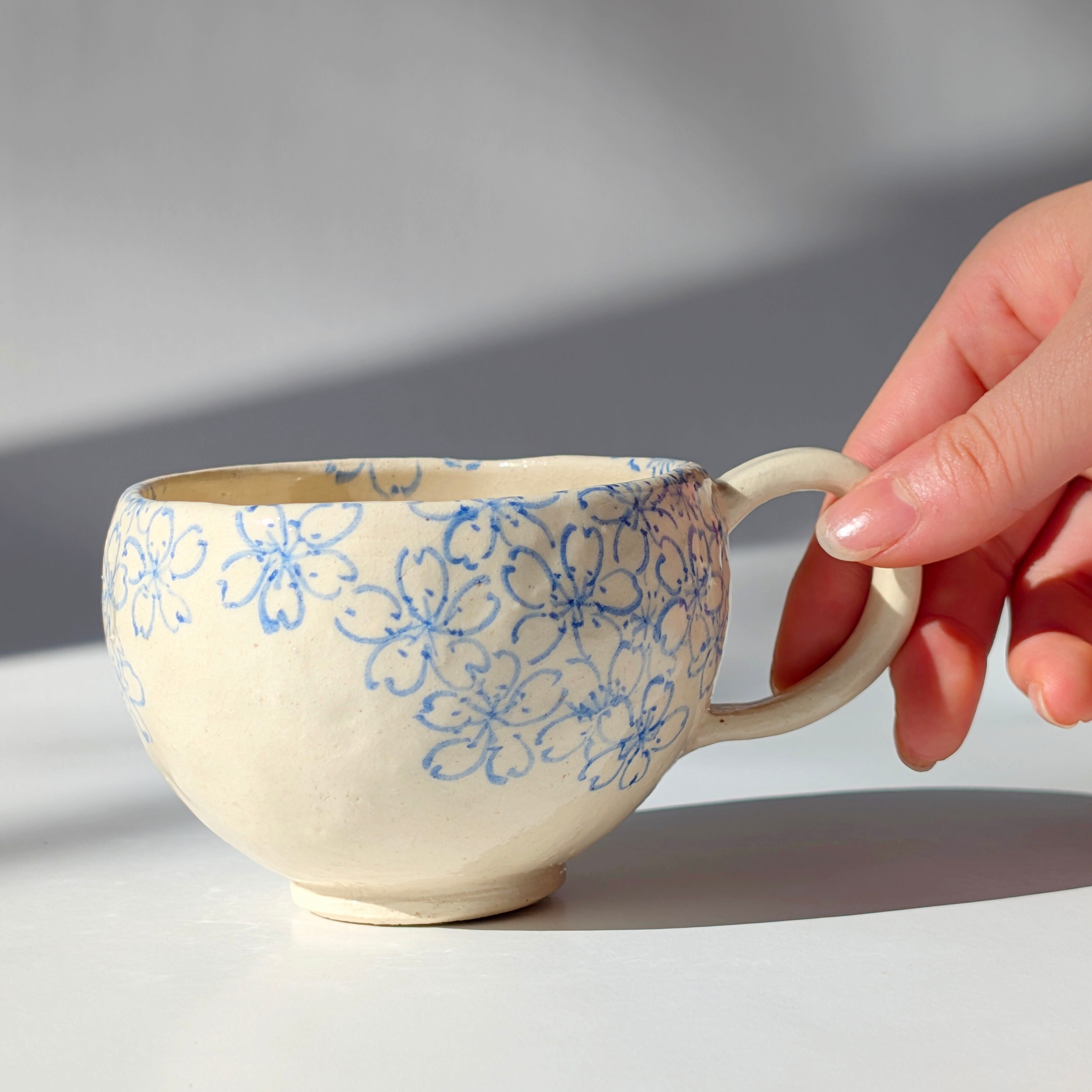 新作のコーヒーカップをご紹介いたします。このカップは、古い文様の桜模様を現代風にアレンジし、アンティークな雰囲気を醸し出しています。