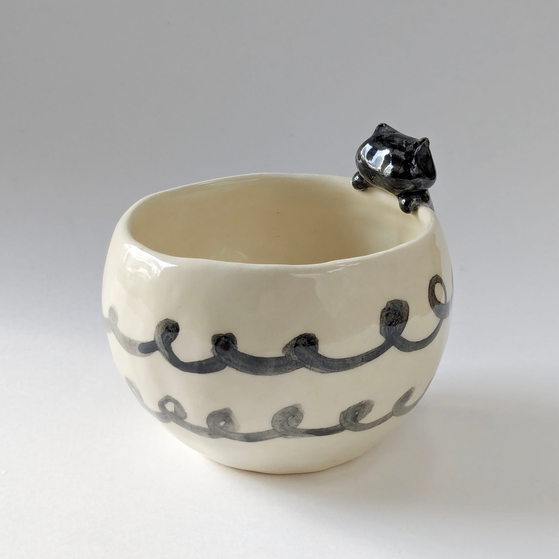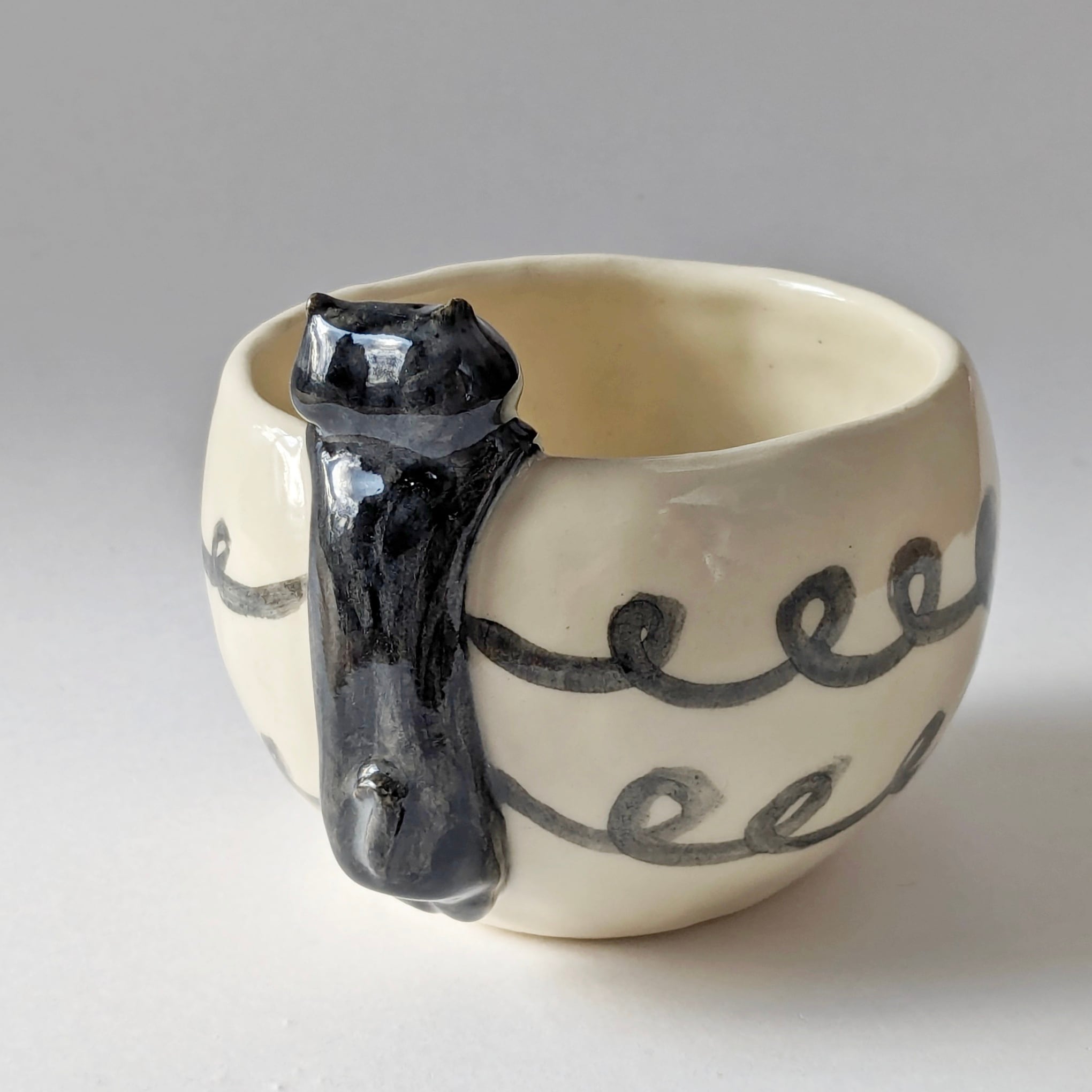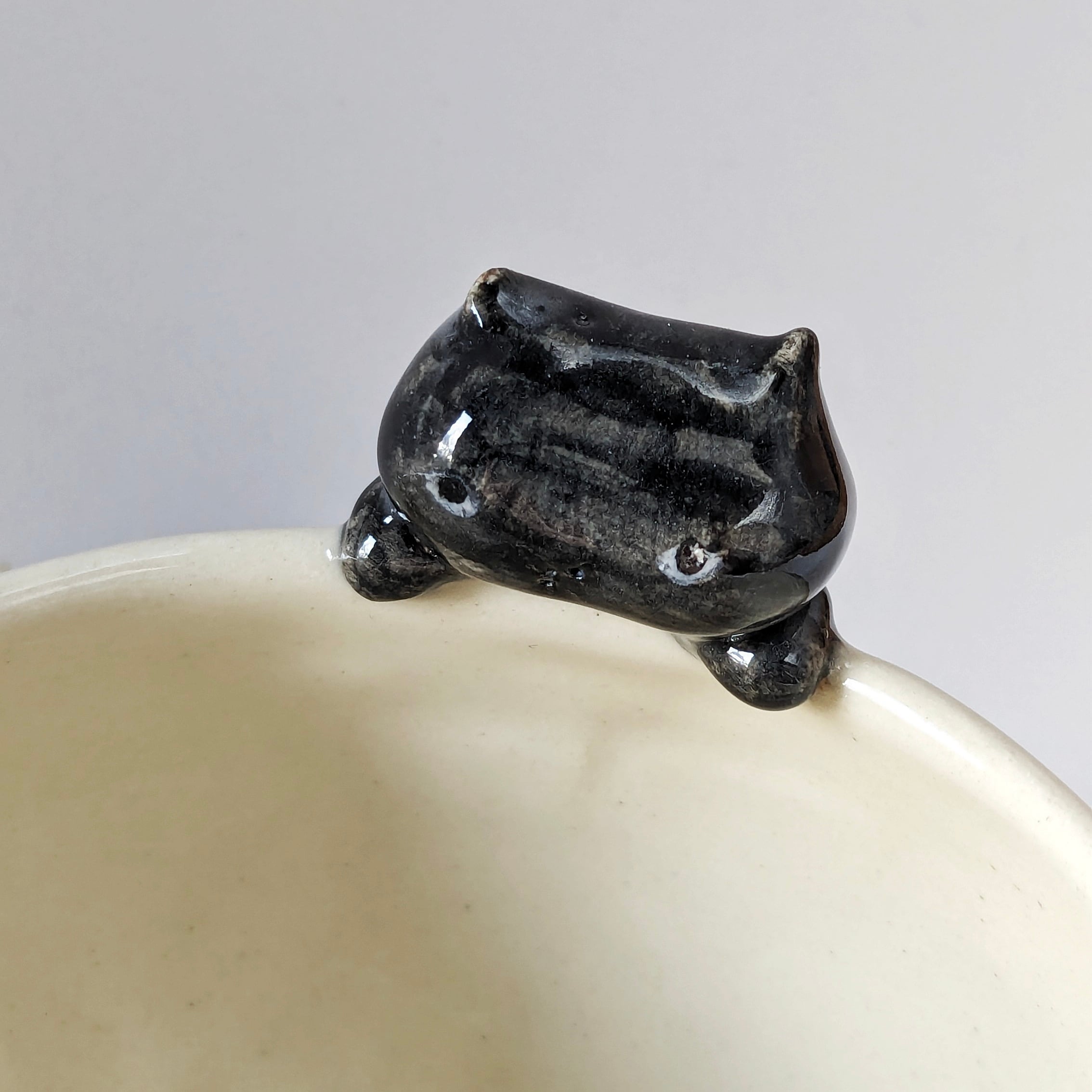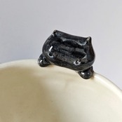 まっくろな胴長猫がぶら下がっている湯呑みです。アンニュイな表情の黒猫ちゃんと見つめ合いながらティータイムを楽しんでみてください。