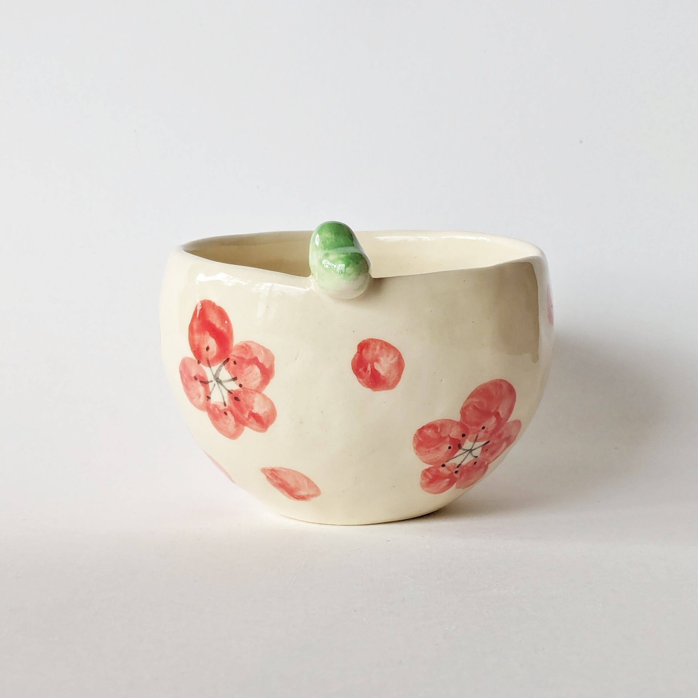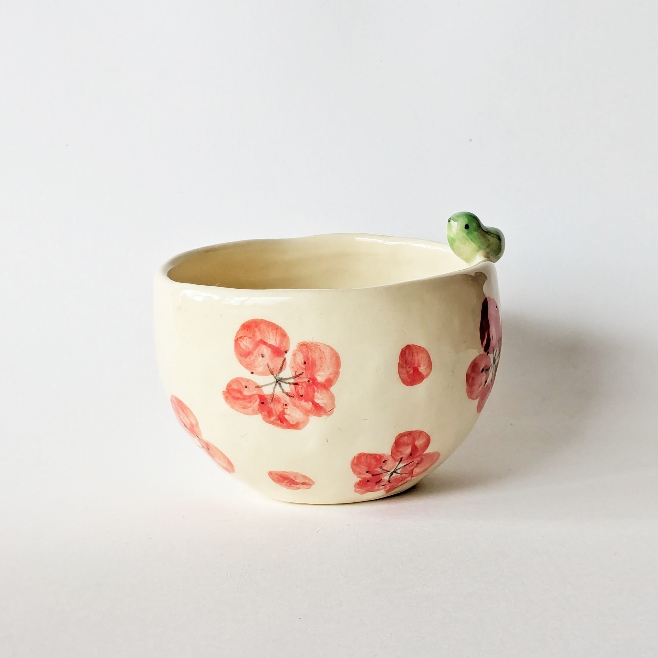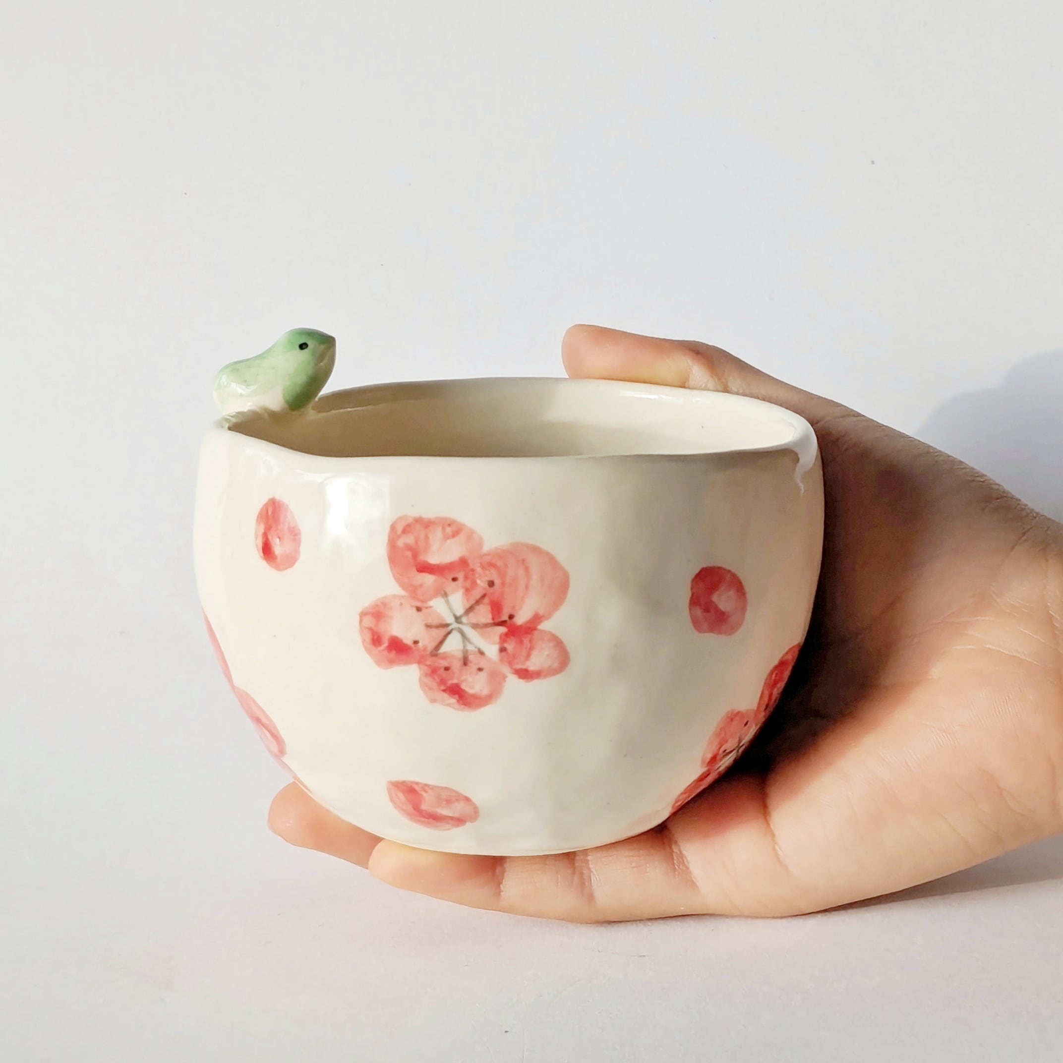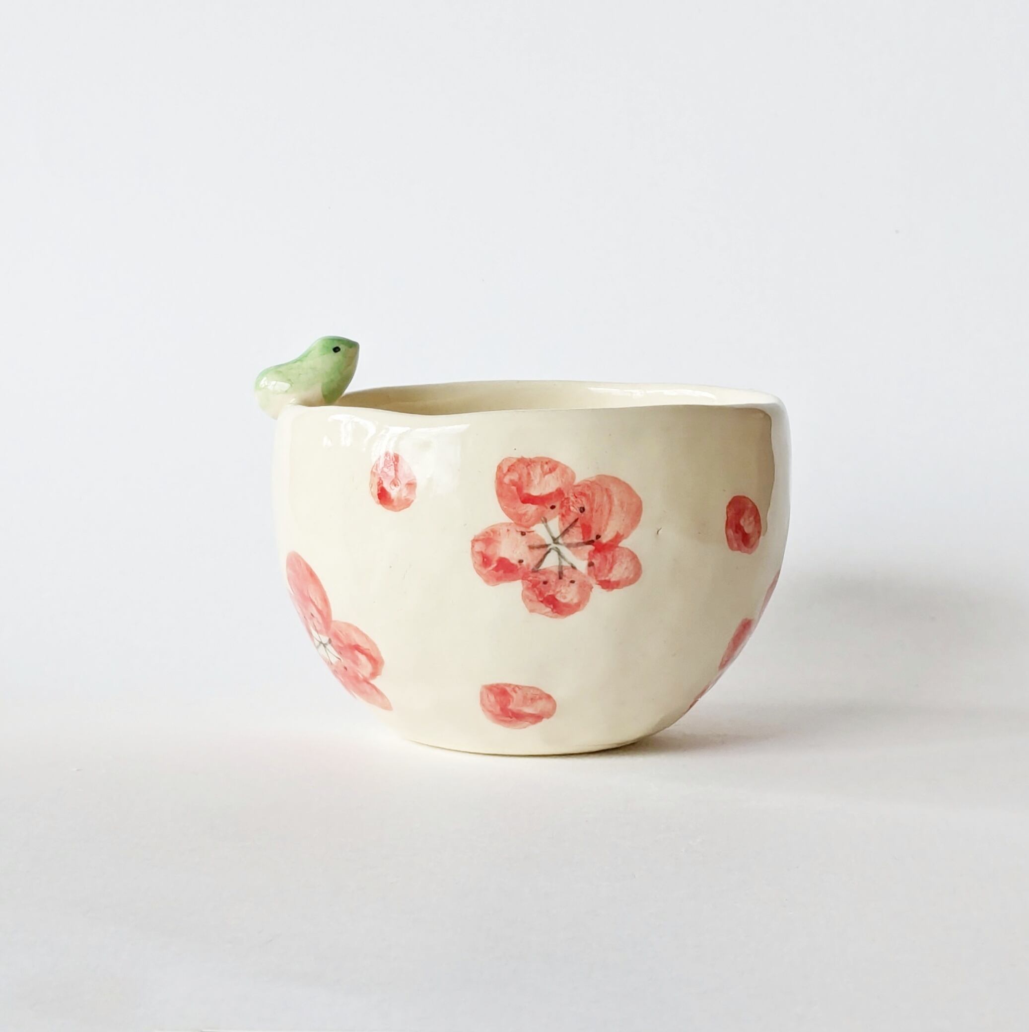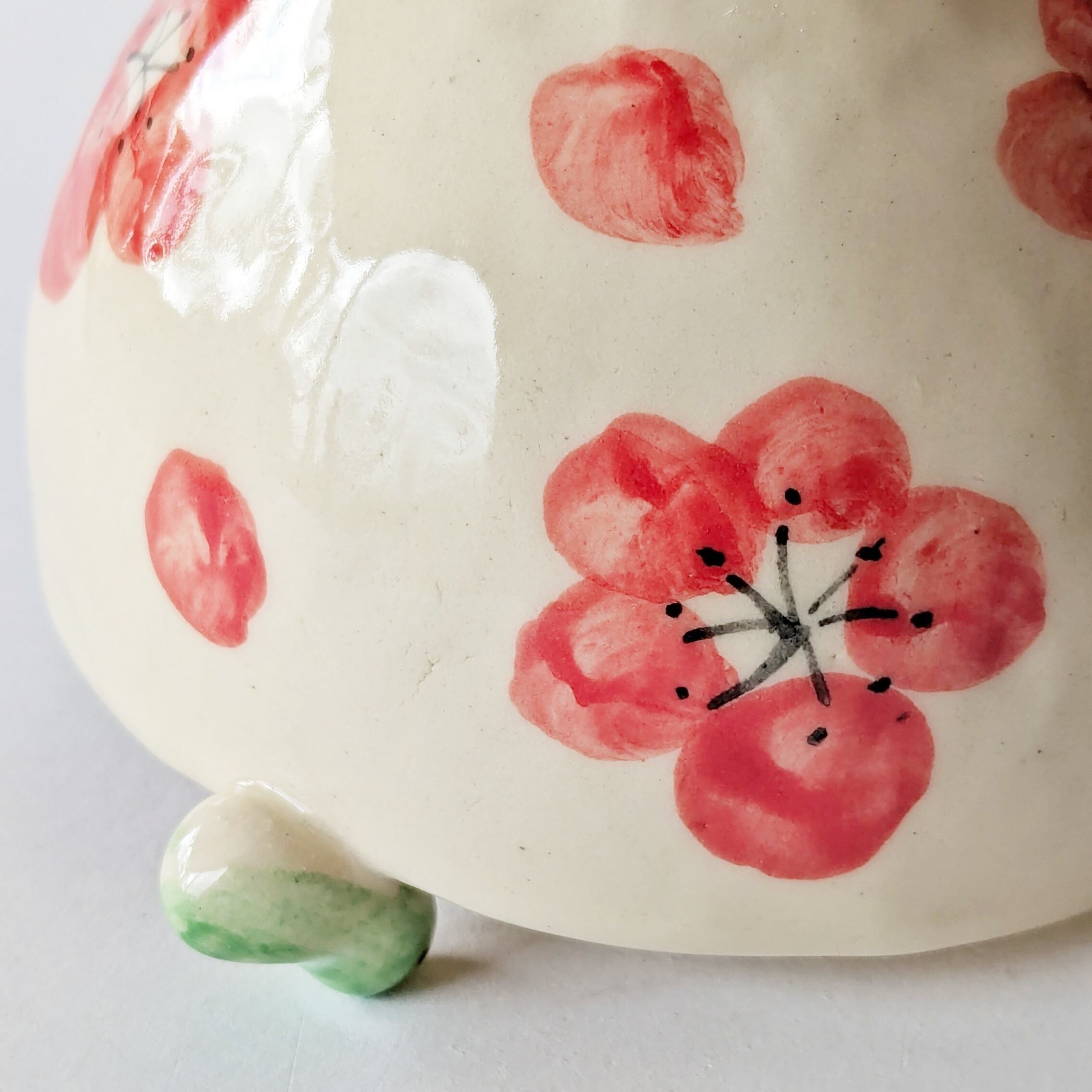 岡本梅林公園の梅をモチーフにしました。冬になるとメジロが花の蜜を求めてやってきます。そのかわいらしい姿を思い出しながら作成しました。今回は高台のないタイプに改良しました。
