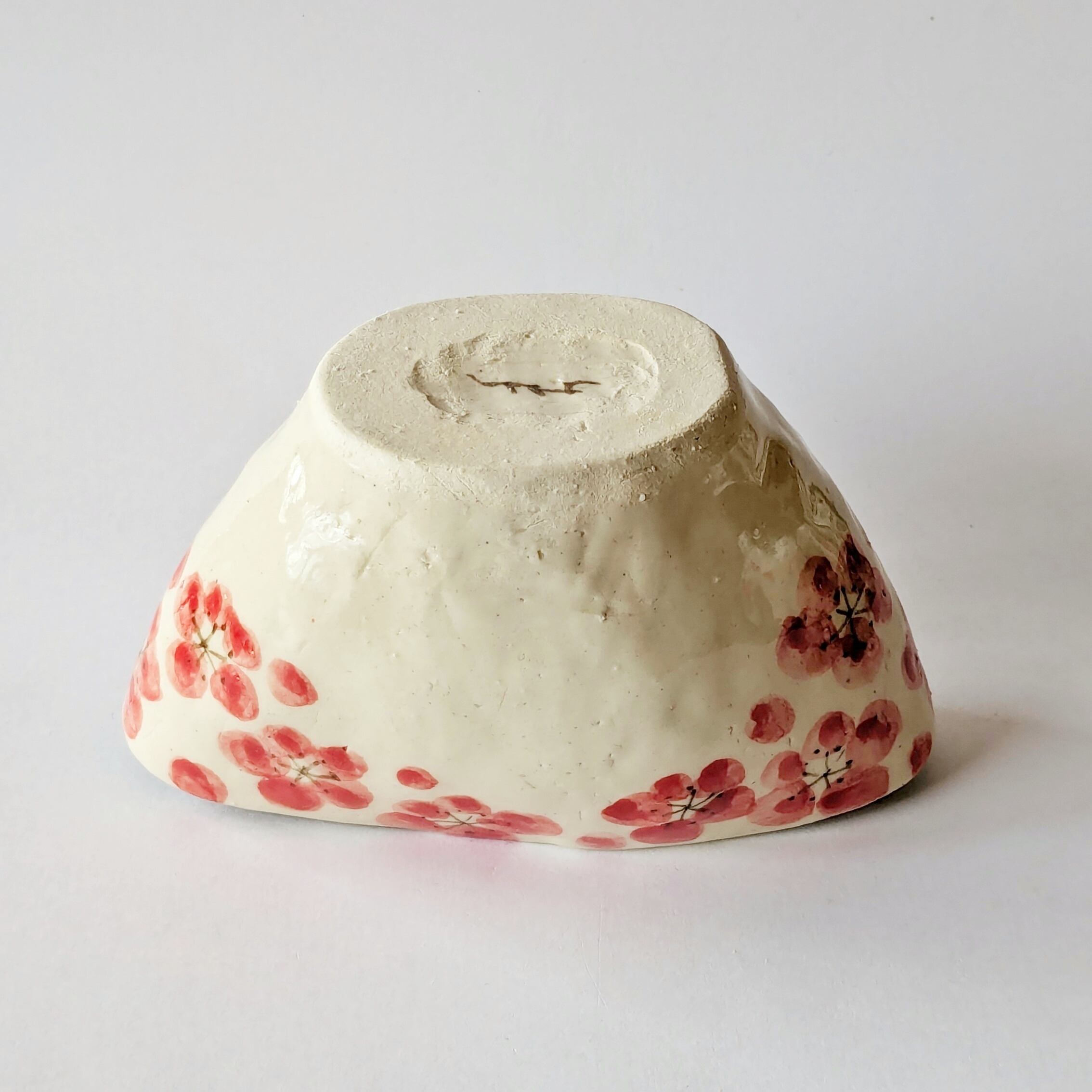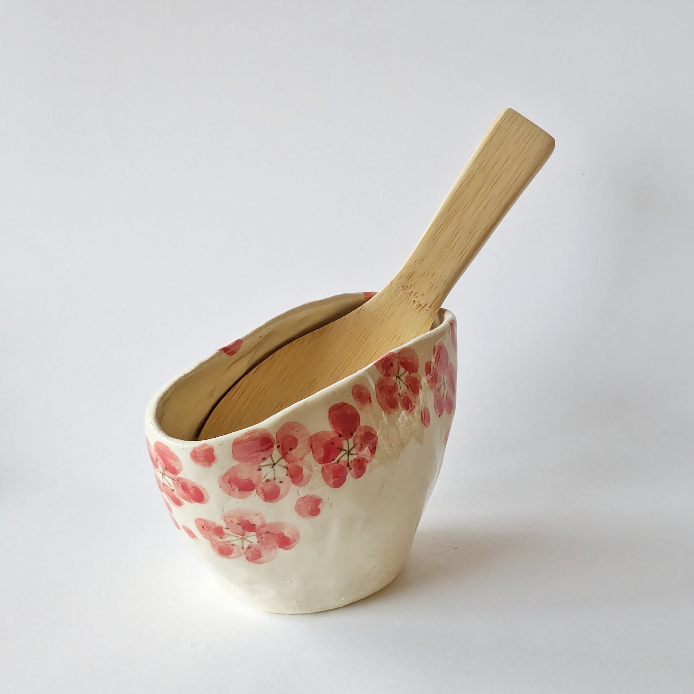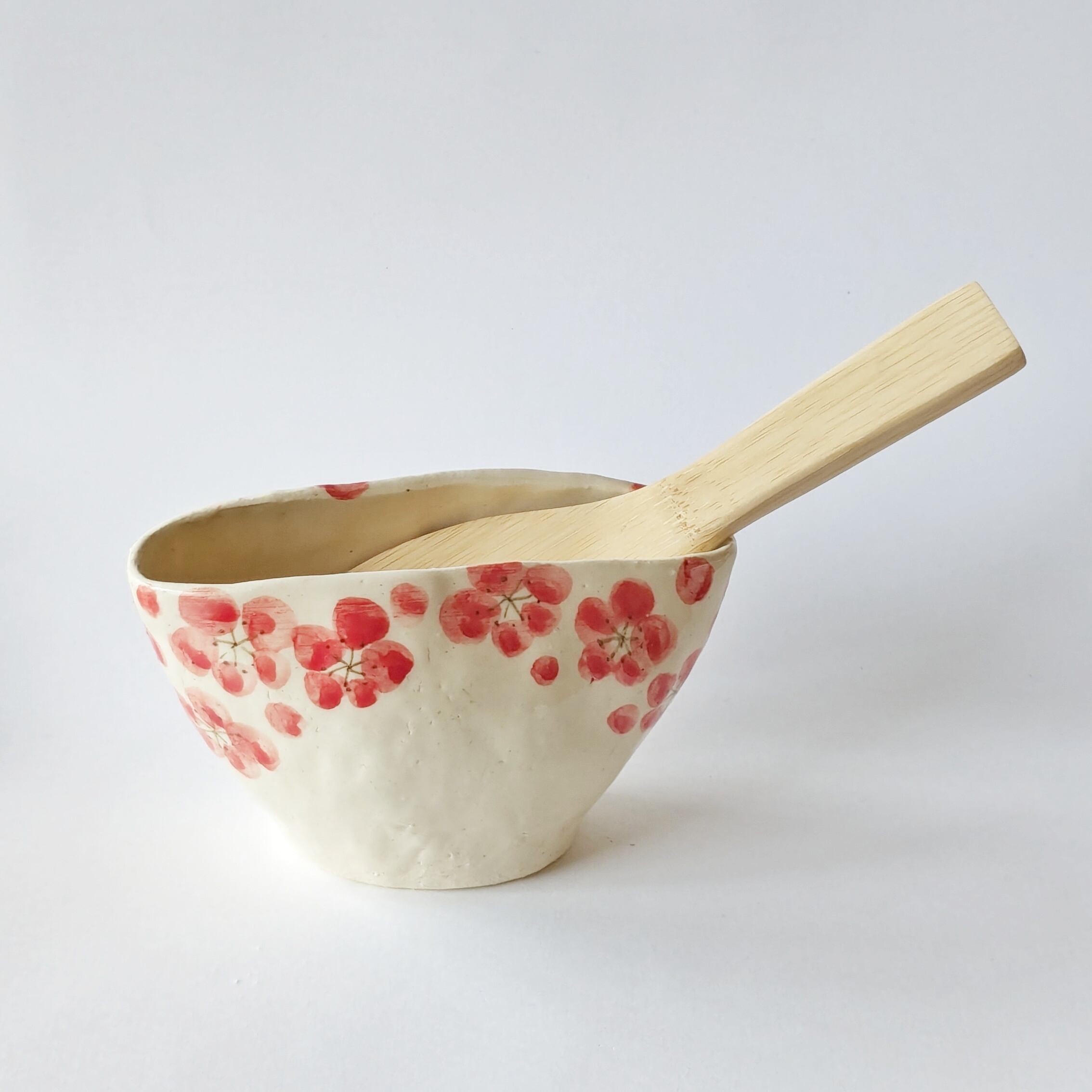 しゃもじ立てはお客様からのリクエストにより作成させていただきました。今回は梅の花をモチーフにつくりました。手びねりと楽焼の手法を使って、底を重めにすることで安定感を高めています。