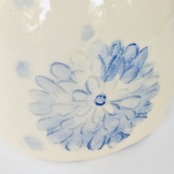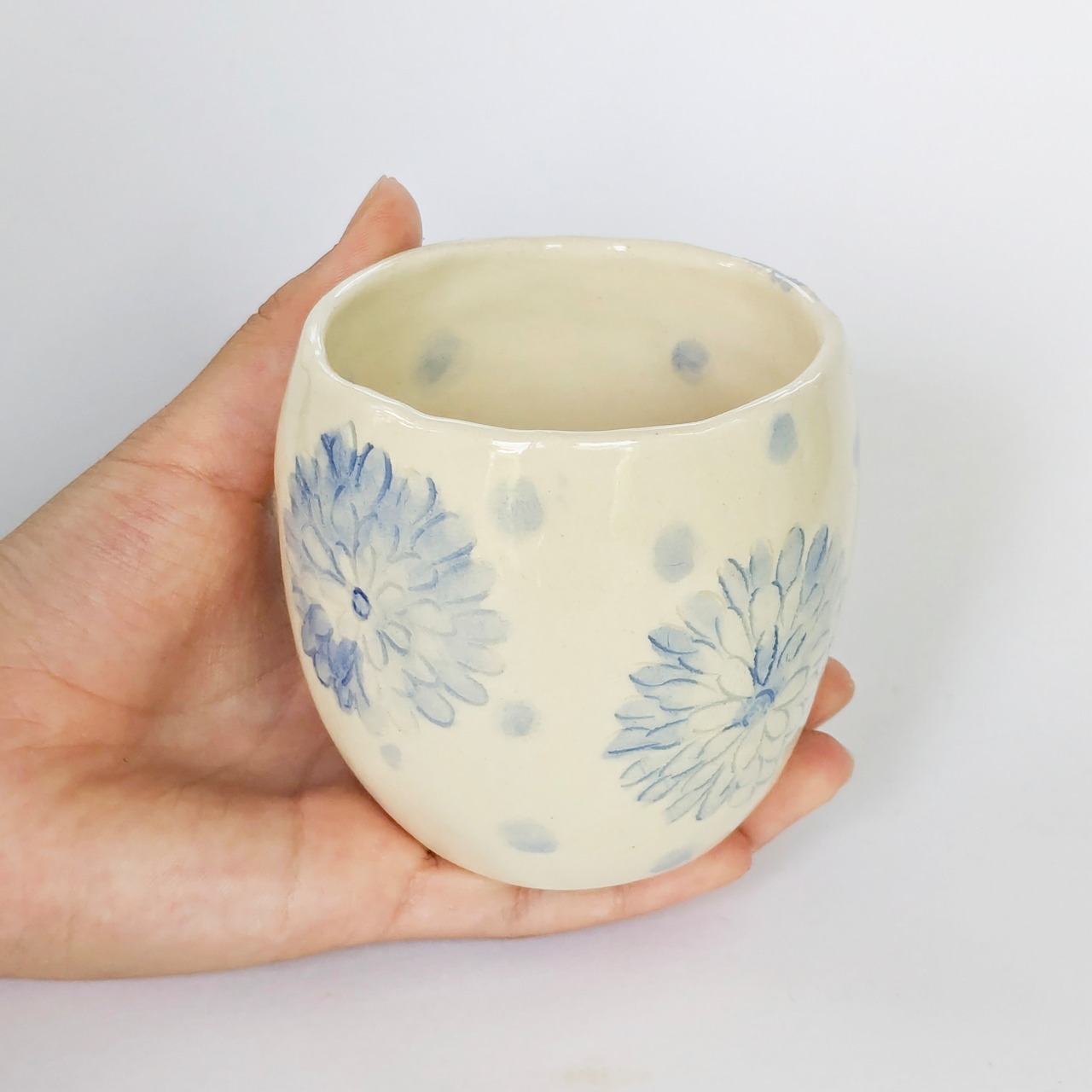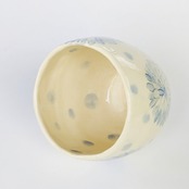 菊の花と水玉模様のコラボ作品です。水玉模様は内側にも描いています。絵付けに彫りを施したことで、持ったときの触感を通して菊の絵柄を楽しんでいただけます。コロンとした丸みを強調したフォルムでかわいらしく仕上げています。