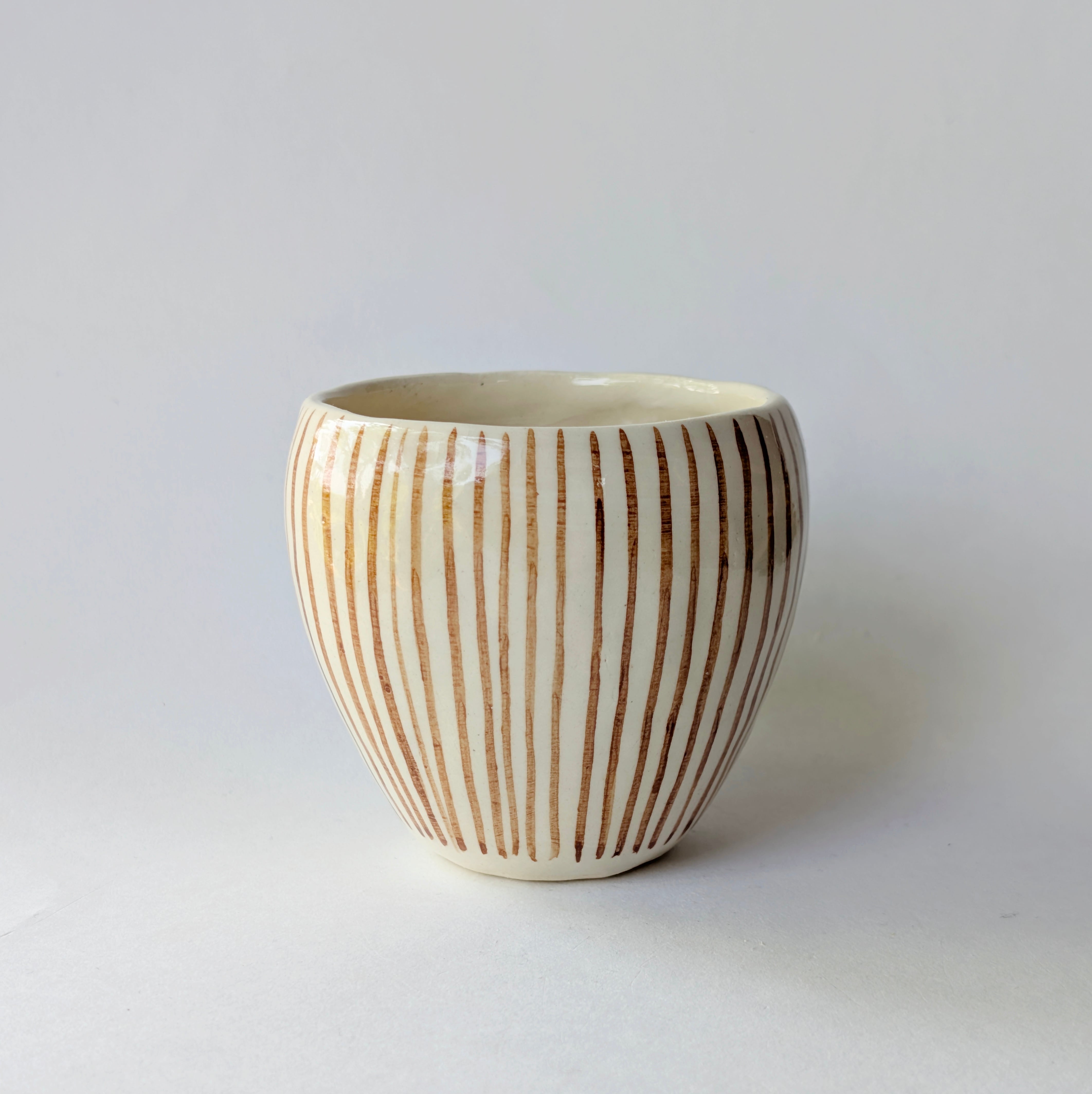 この美しい縦縞模様を一層引き立てているのが、素地(きじ)に施された「白化粧(しろげしょう)」。柔らかな白が背景となることで模様が際立ち、土の温もりを感じさせつつも洗練された印象を与えます。
