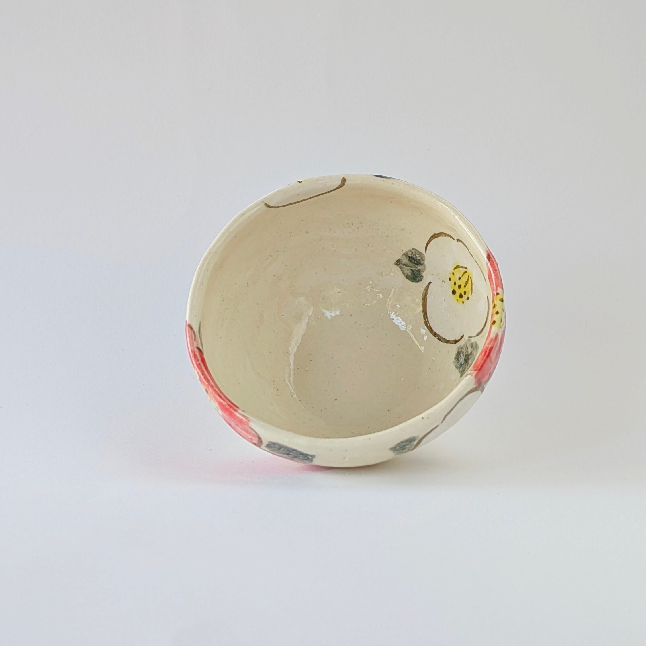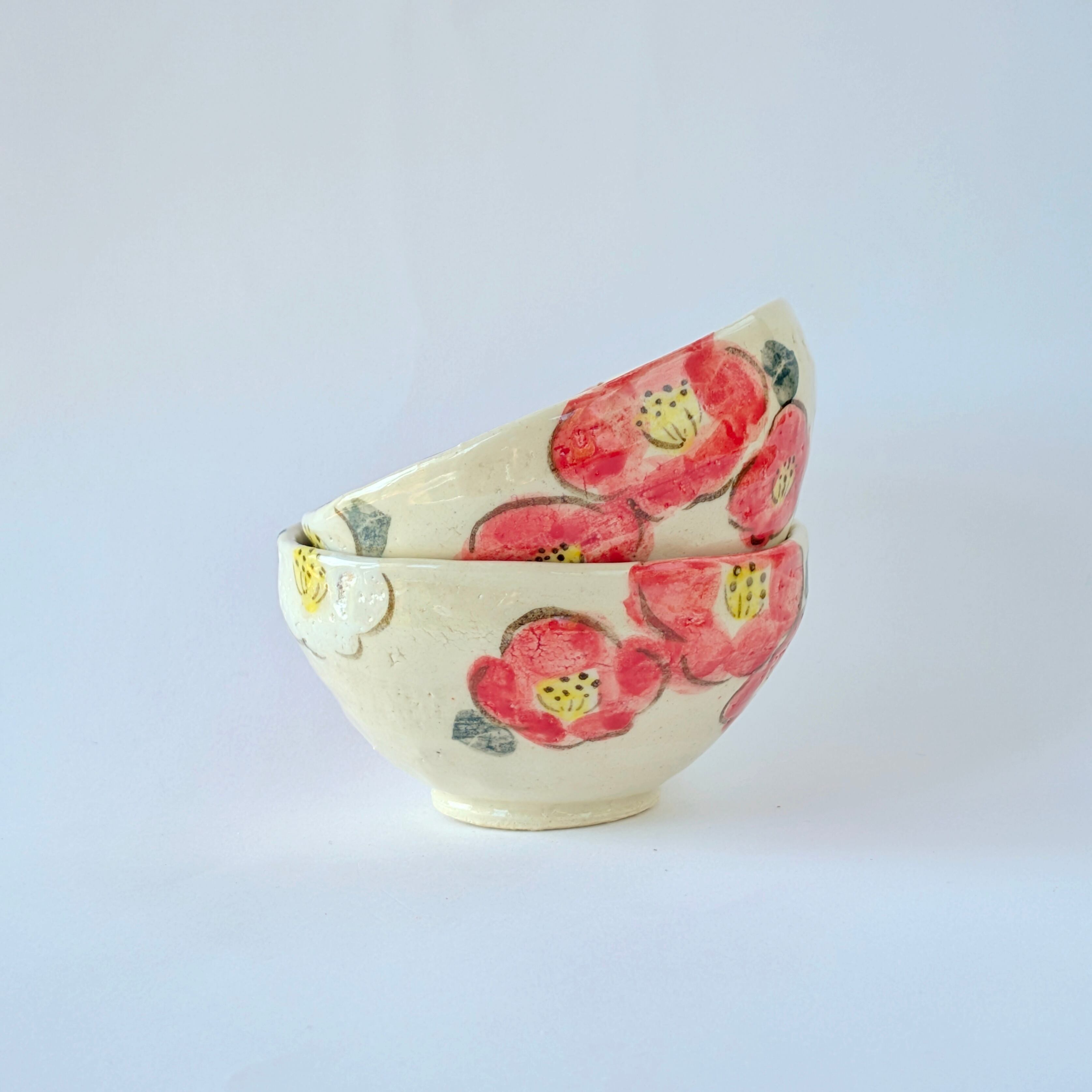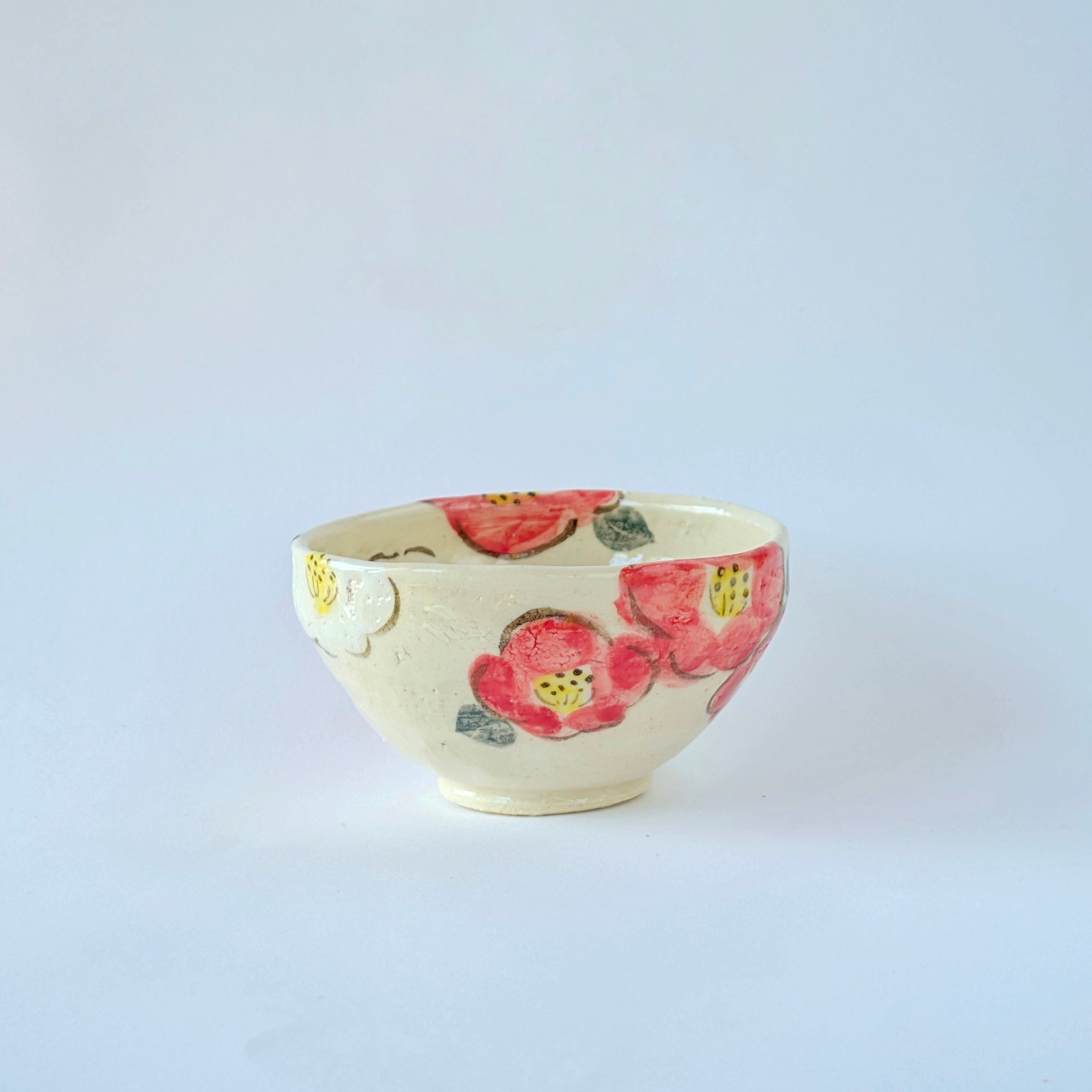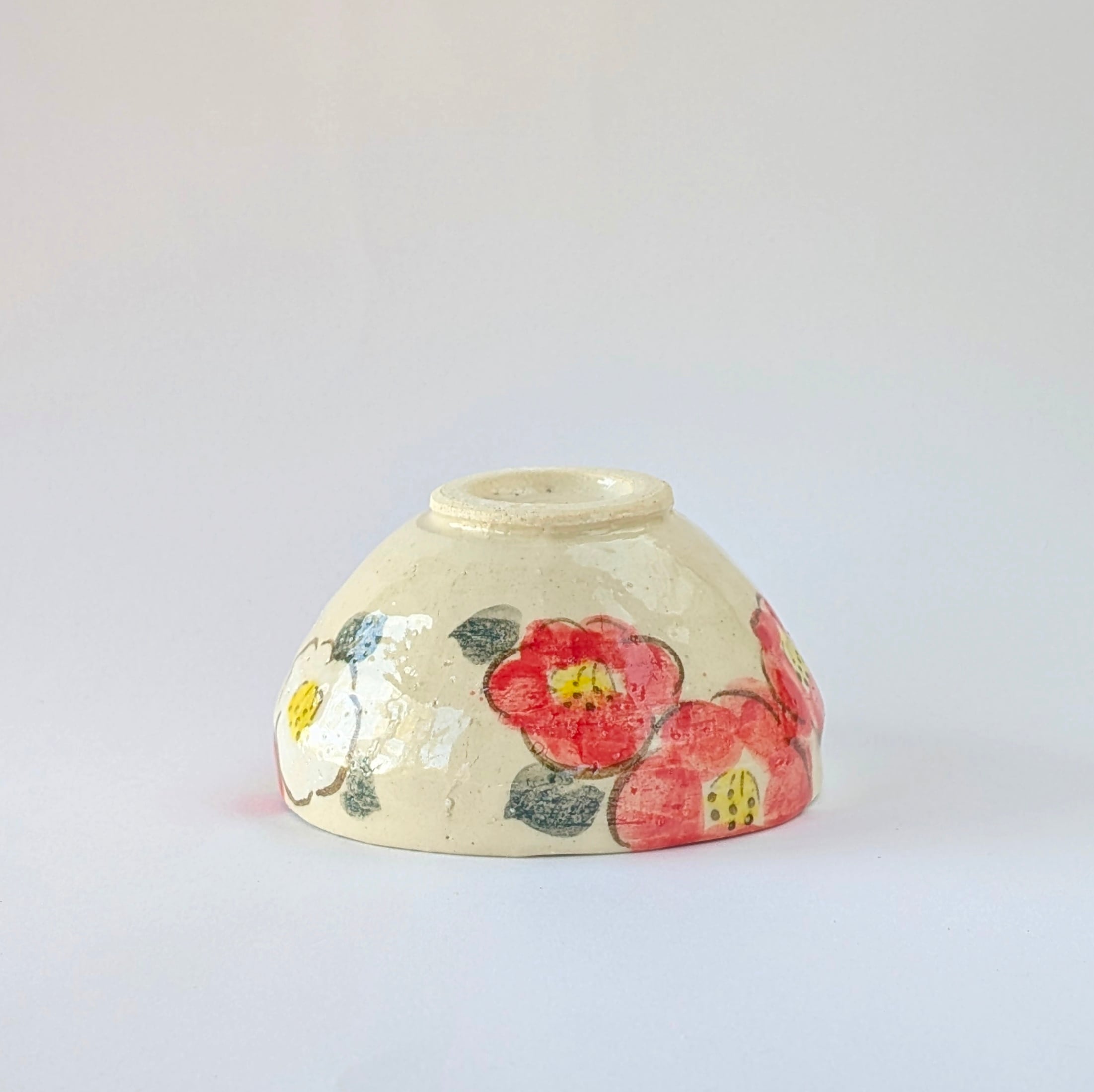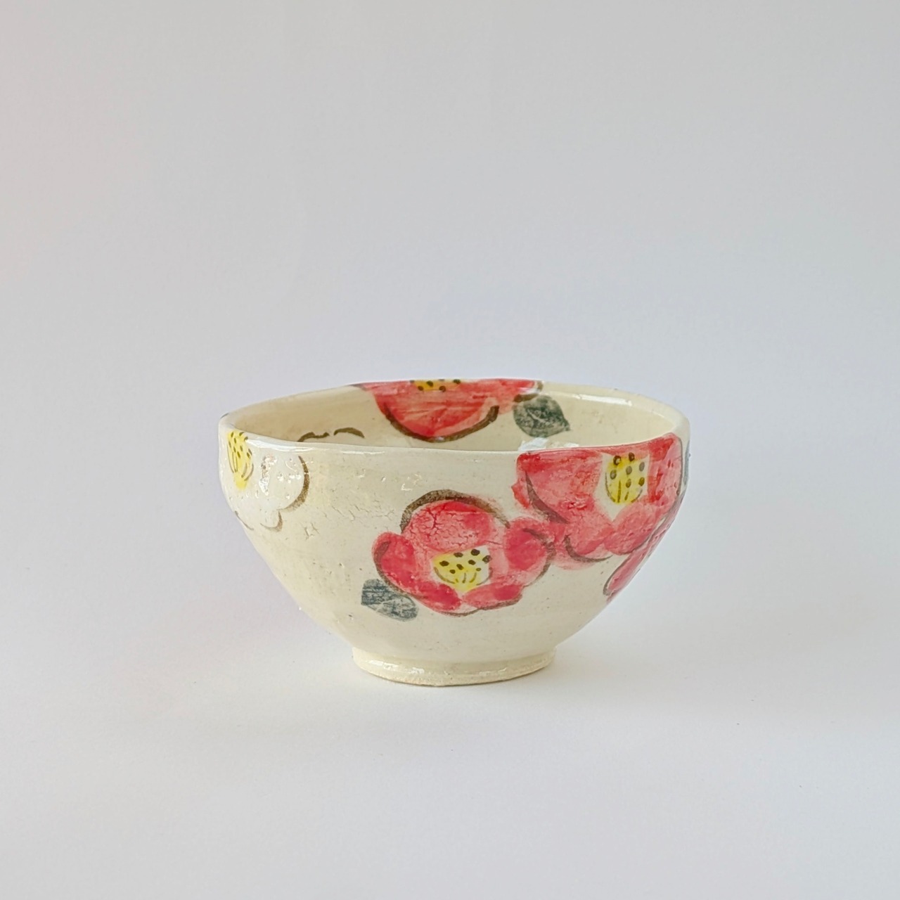椿の花模様の飯茶碗です。お客さまのご希望で少しだけ大きめサイズのものをつくりました。