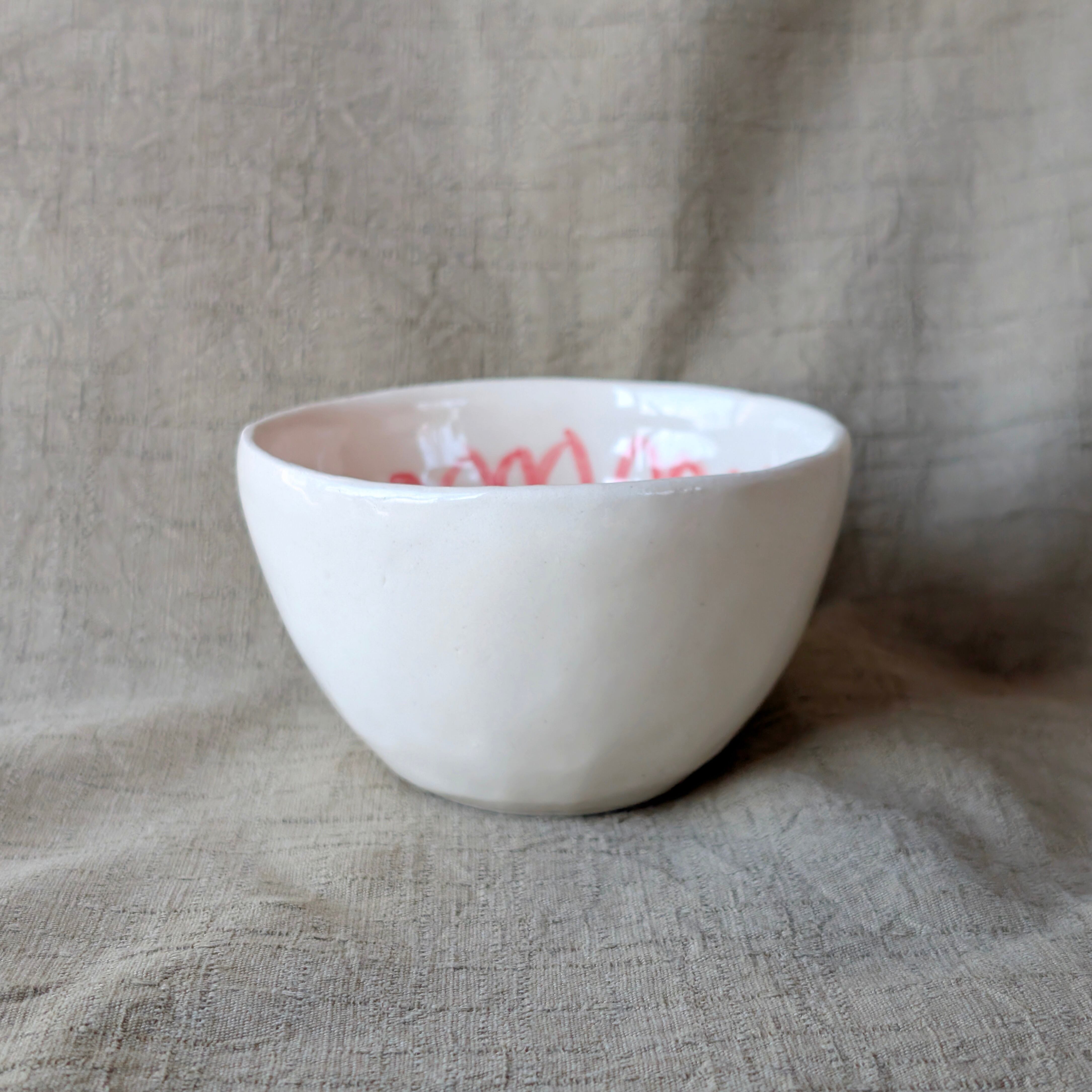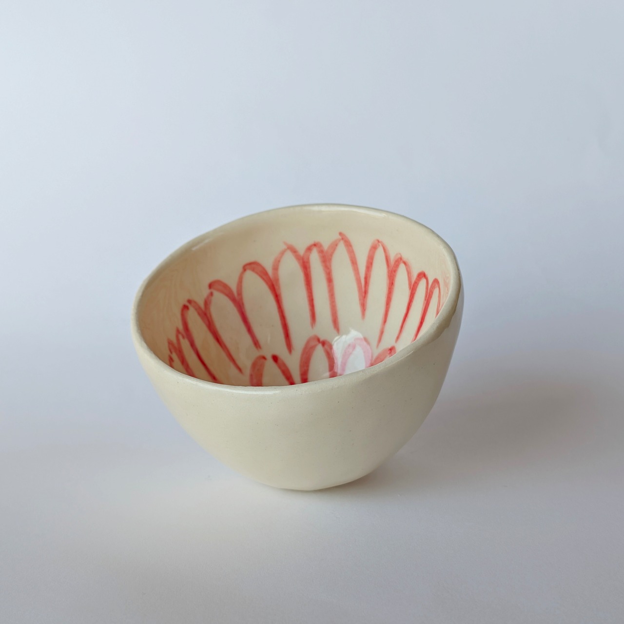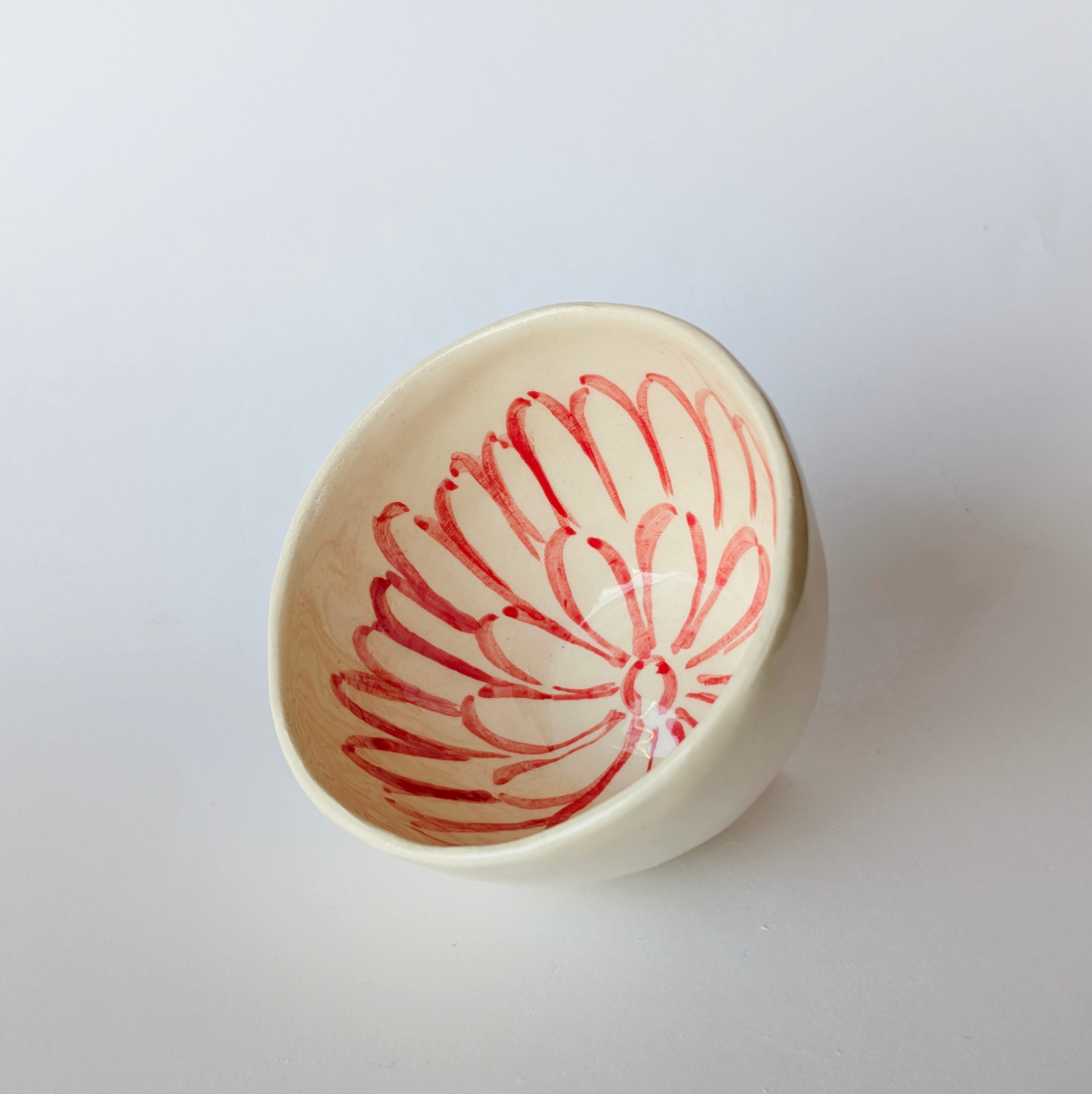 大胆に真っ赤な菊の文様を内側に描きました。小鉢としてもお使いいただけます。コロンとした丸みを強調したフォルムでかわいらしく仕上げています。
